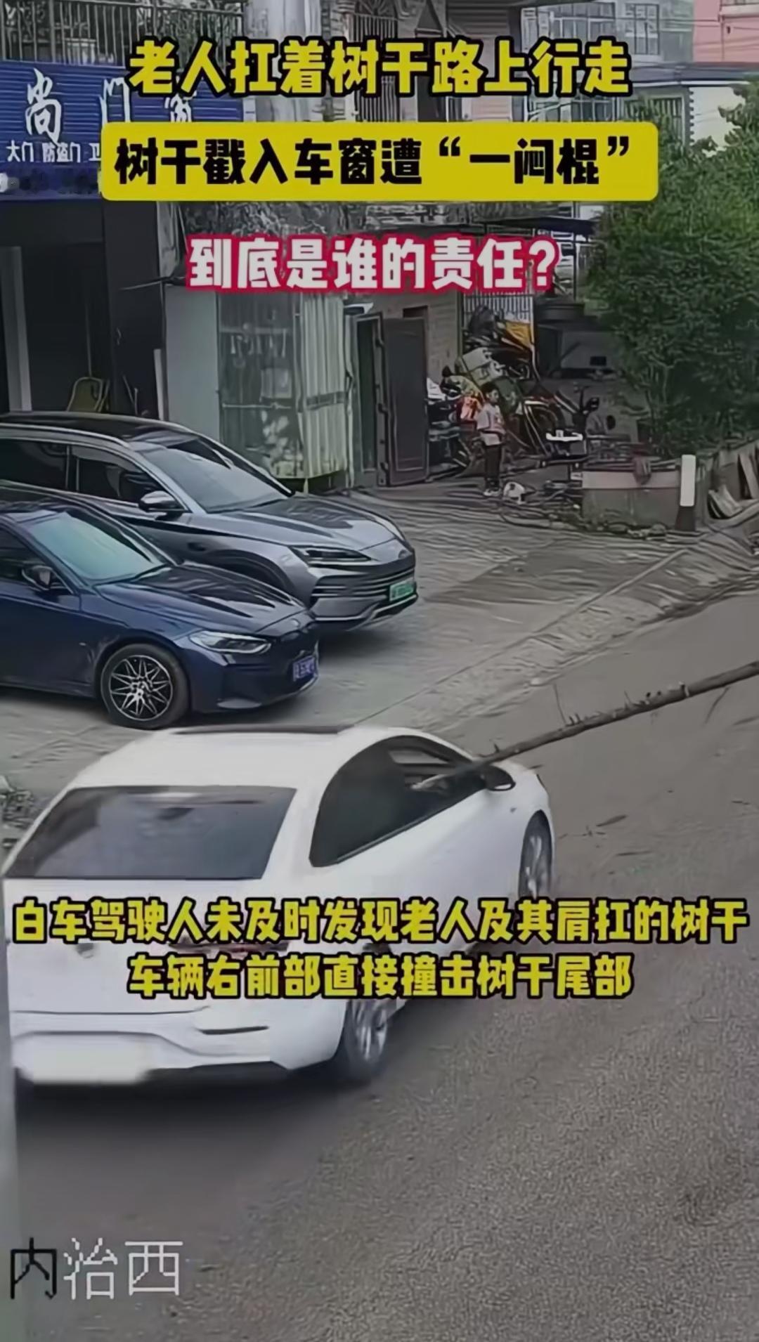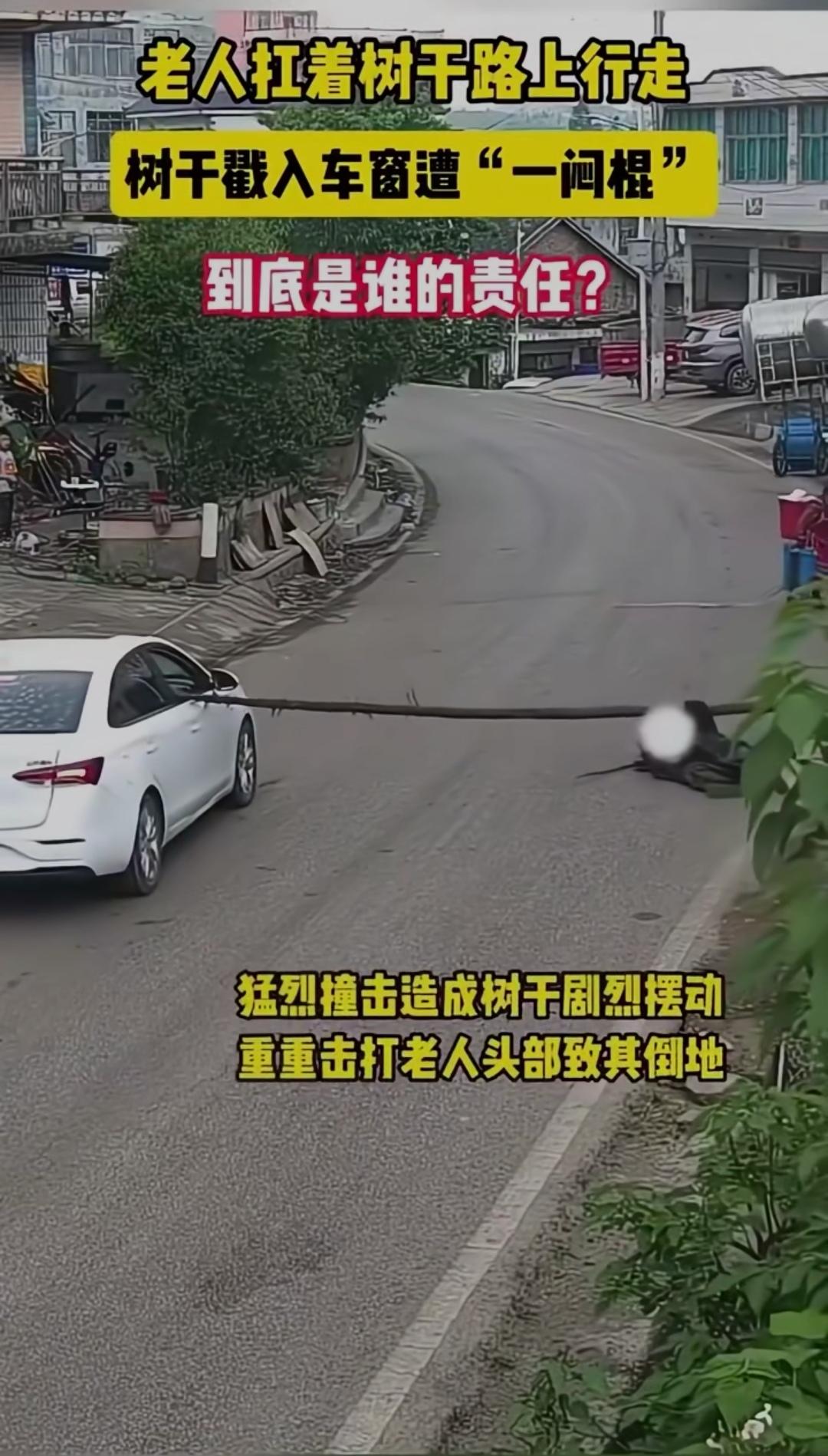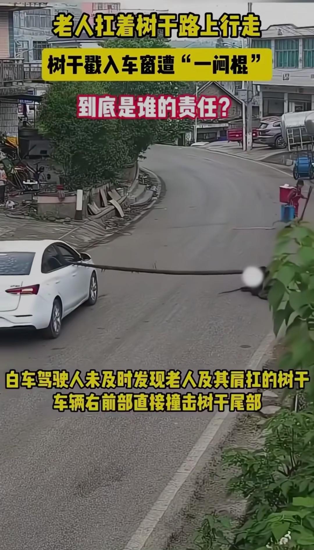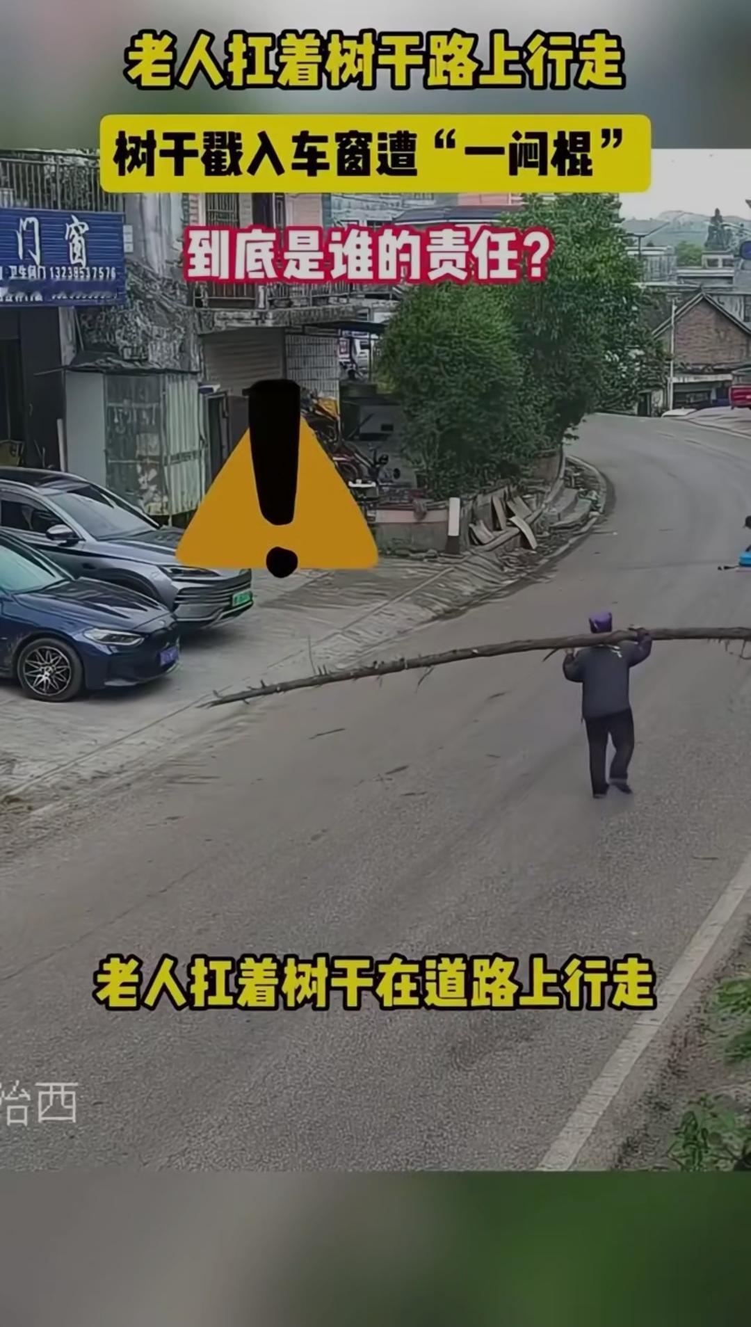 老人扛树干路上行走,树干戳入车窗遭"一闷棍",到底是谁的责任?一闷棍应该能打醒他 马路上一幕让人揪心又无语:一位老人扛着长长的树干,在路边慢慢行走。谁也没想到,一辆白色轿车正常驶过,树干突然戳进车窗,巨大的惯性狠狠反弹,给老人当头一闷棍,老人当场摔倒受伤,车辆也被刮损。 监控一出,全网吵翻。有人骂司机:开车不看路,眼瞎吗?有人怒怼老人:扛这么长的棍子走马路,本身就是移动隐患,凭什么让司机买单? 更炸锅的是交警判定:司机未仔细观察路况,承担全部责任。 这个结果,让无数车主瞬间破防。 大家不是不心疼老人,而是觉得太冤:我规规矩矩开车,你扛着超长物品占道,我还要为你的危险行为买单?法律上,机动车负有高度注意义务,遇到行人必须避让;可情理上,老人肩扛树干,超出正常行走范围,本身就存在明显过错。 这不是简单的谁弱谁有理,而是规则与情理的碰撞。马路不是自家院子,超长物品本就不该随意上路;司机更要眼观六路,预判一切意外。 一件小事,戳中多少人的出行痛点:你遇到过路上乱扛东西、乱骑车的行人吗?你觉得这个判罚公平吗?评论区说说你的看法!