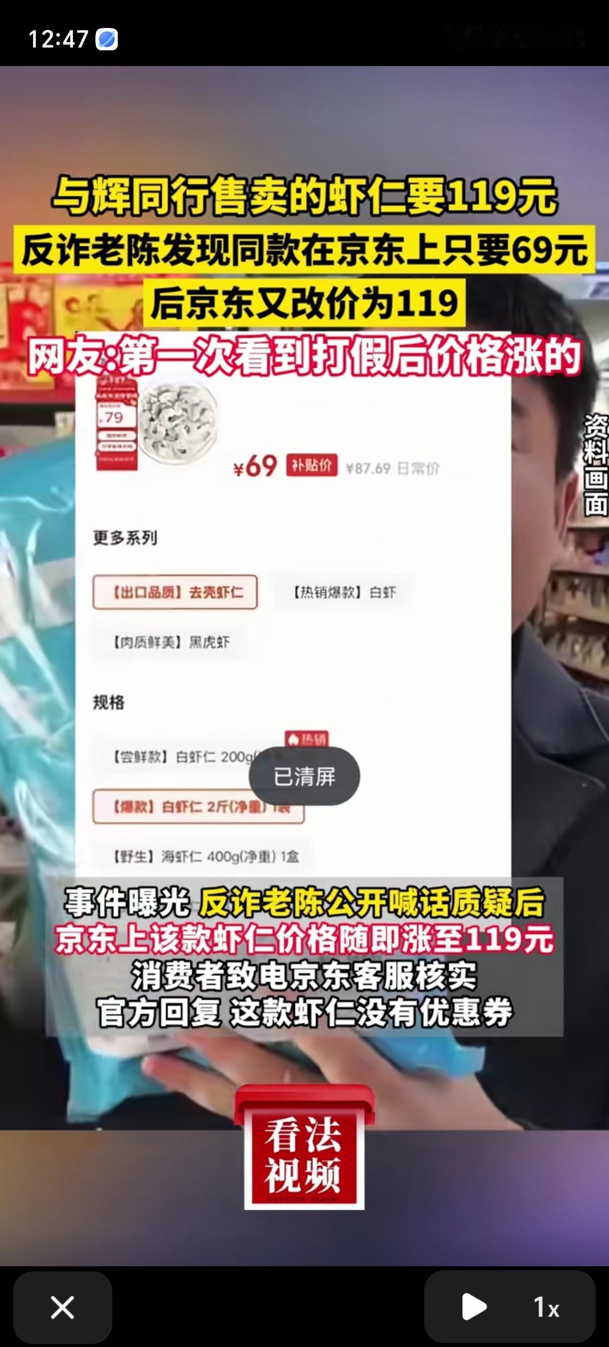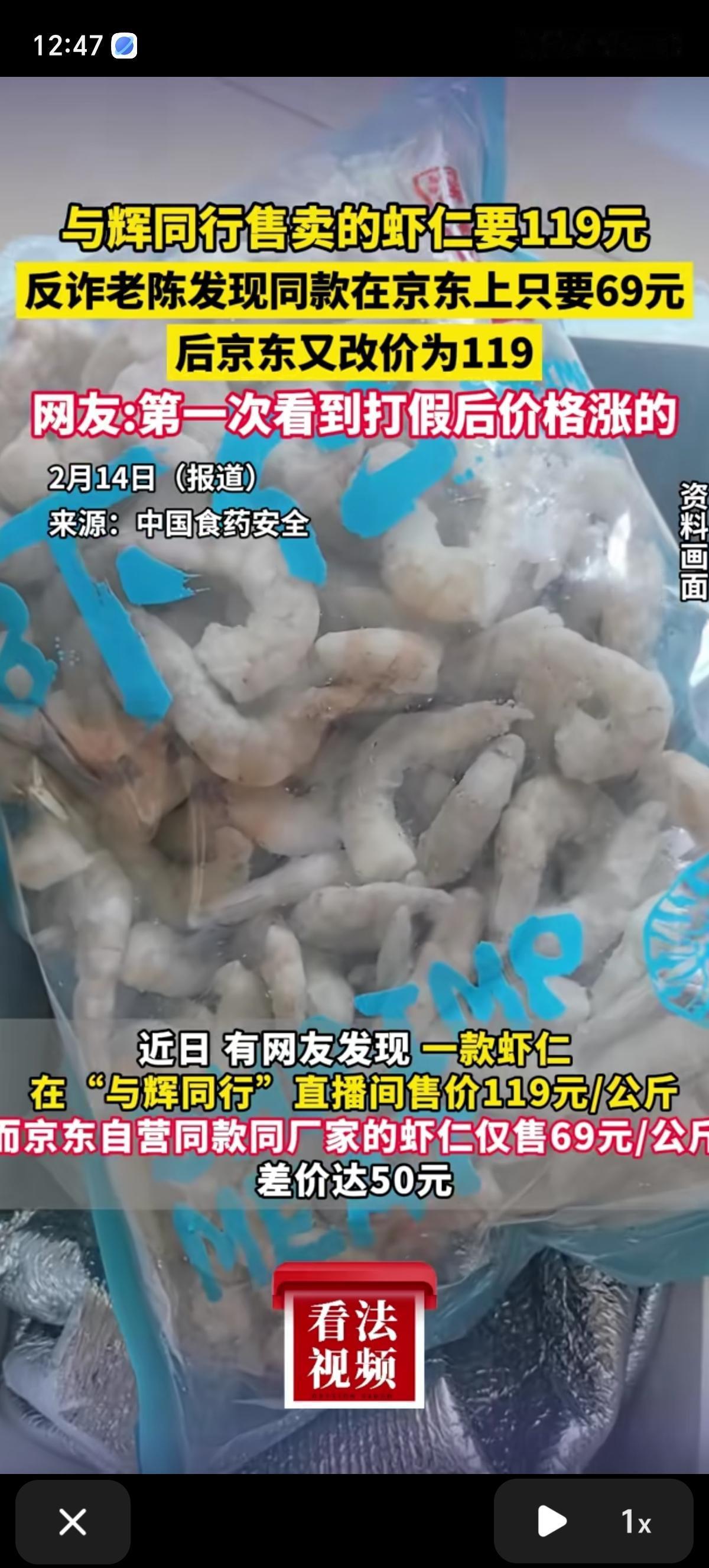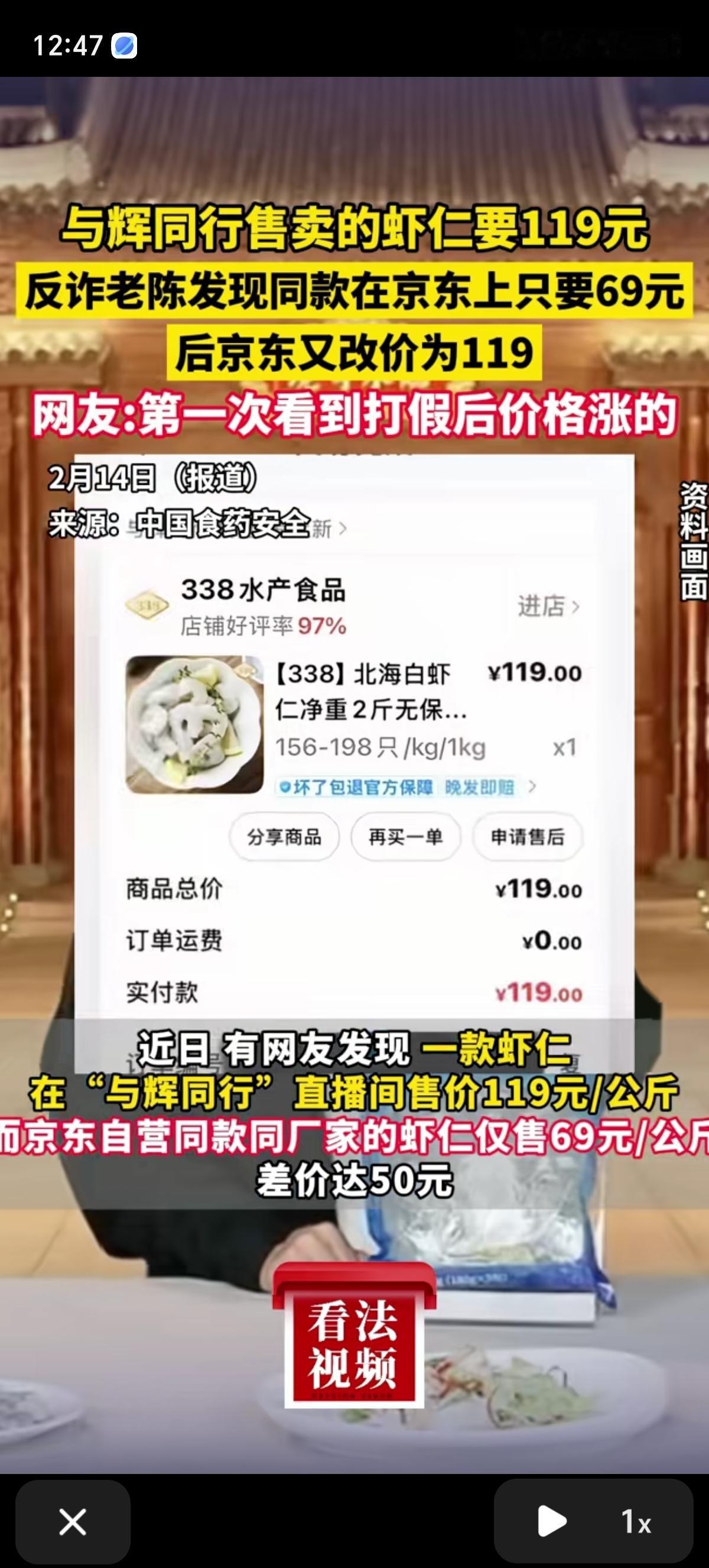 “反诈老陈”从“与辉同行”直播间花119元买了2斤虾仁,结果在京东发现同款虾仁花60元就能买到2斤。没想到老陈说出来之后,京东的虾仁反而涨价了,变成了119元二斤。 1月31日反诈老陈在“与辉同行”直播间,以119元/2斤的价格购买了万景海产的虾仁。 2月9日老陈在京东发现同款同厂虾仁,使用平台补贴券后到手价为69元/2斤,并下单购买。 11号的时候老陈在视频中拿着两款差了50元的的虾仁,展示了两边的订单和实物对比,强调生产日期、包装规格完全一致,质疑直播间定价过高。 在老陈公开喊话质疑后,有网友发现,京东平台上的这款虾仁价格直接从69元涨到了119元,与“与辉同行”直播间的售价完全一致。有消费者致电京东客服核实,官方回复称该商品没有优惠券,这一“打假后价格反而上涨”的现象引发了全网热议,网友调侃“第一次看到打假把价格打上去的”。 现在相关视频已经下架了,给出的理由是:直播间售价包含商家承担的物流与履约成本,而京东属于自营入仓模式,仓储和配送由平台承担,商家成本不同;此外,京东的低价部分来自平台补贴,并非商家定价。 目前“与辉同行”和万景海产均未针对此次价格争议公开发声。老陈就问了:“为什么我一喊话,价格就立刻改回来?是不是一个谎言,需要用更多的说法去圆?”