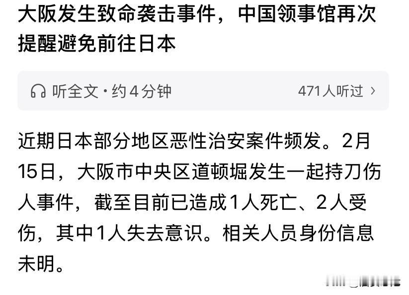 这是第几次提醒了? 日本大阪发生致命袭击事件,中国领事馆再度提醒避免前往日本!