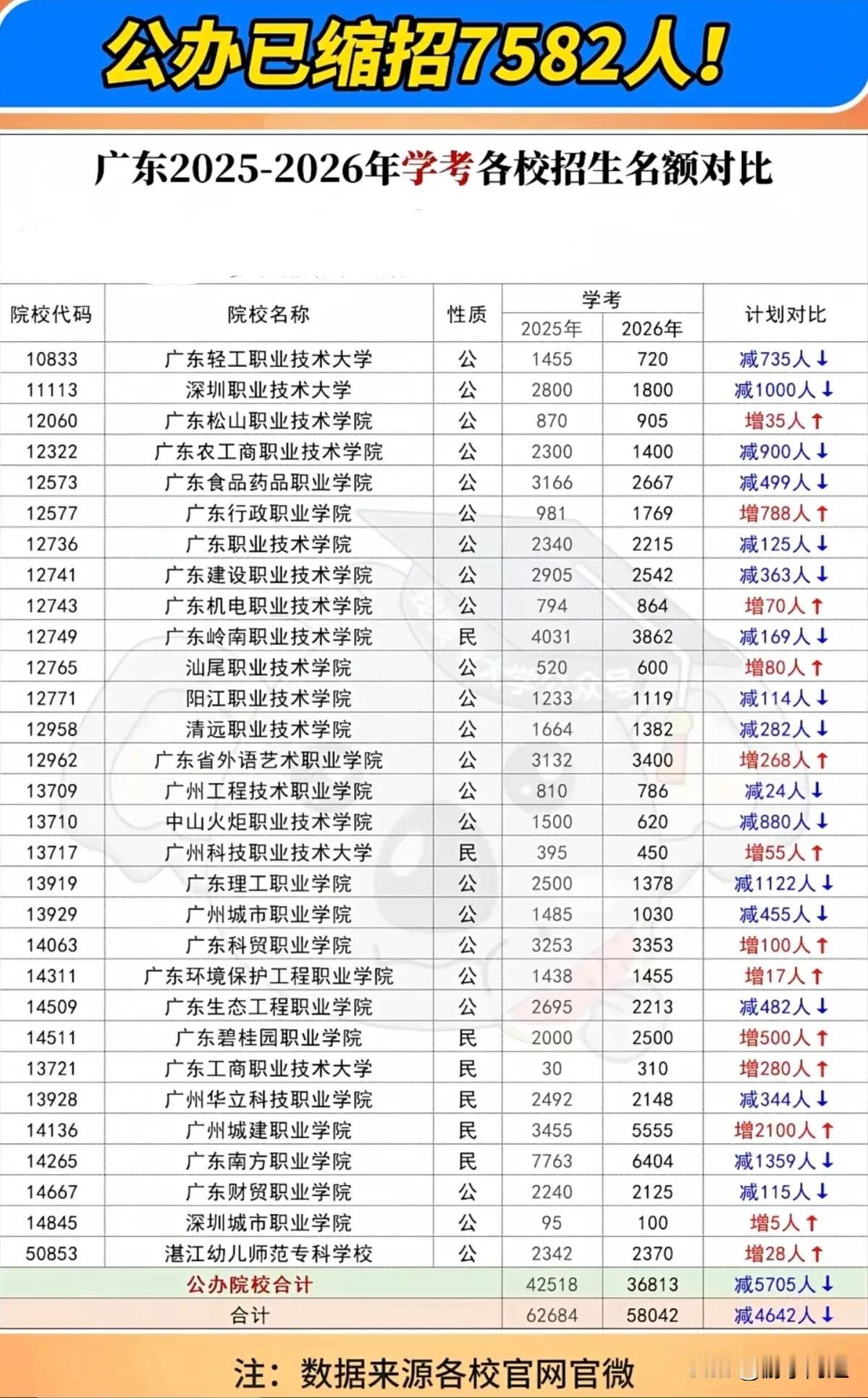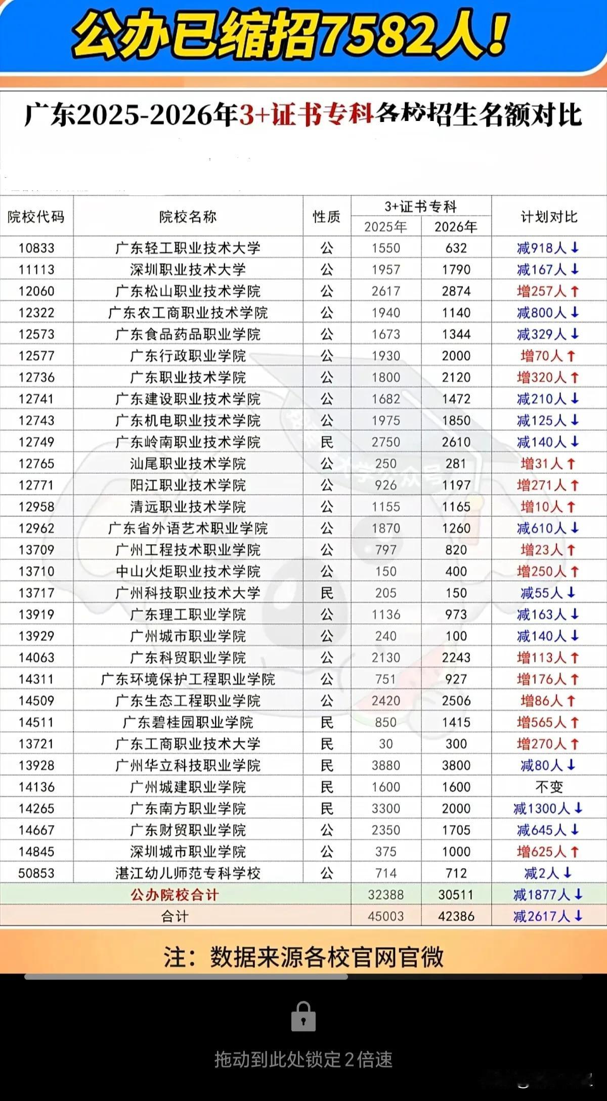 广东省30所公办院校已发布2026年春季高考招生计划。 根据这30所公办院校公布的2026年招生数据,无论是学考招生名额还是"3+证书"专科层次的招生规模,均较去年呈现缩减态势。 预计在政策导向下,尤其广东省内头部公办职业院校的招生规模将进一步压缩。