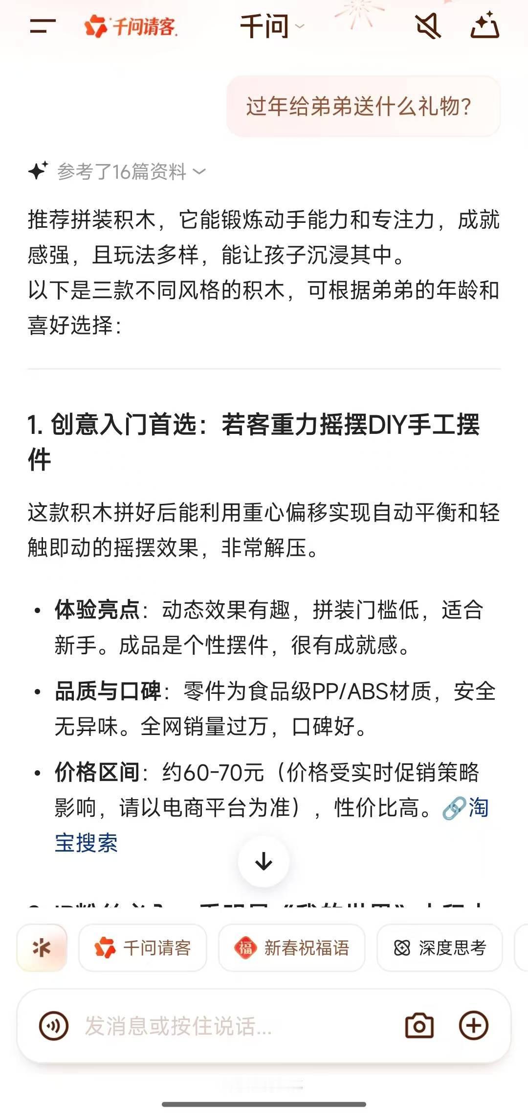 今年的年货都是AI一手包办用千问买年货可太省心了!给弟弟挑礼物直接让千问推荐,让我买拼装积木,能锻炼孩子的动手能力和专注力,而且现在用超级免单卡下单还能减25块,划算!而且买零食水果,买电影票、车票,都能用这个免单卡!还有千问新用户吗,给我多来点免单卡~~千问超级免单卡能买年货能买票