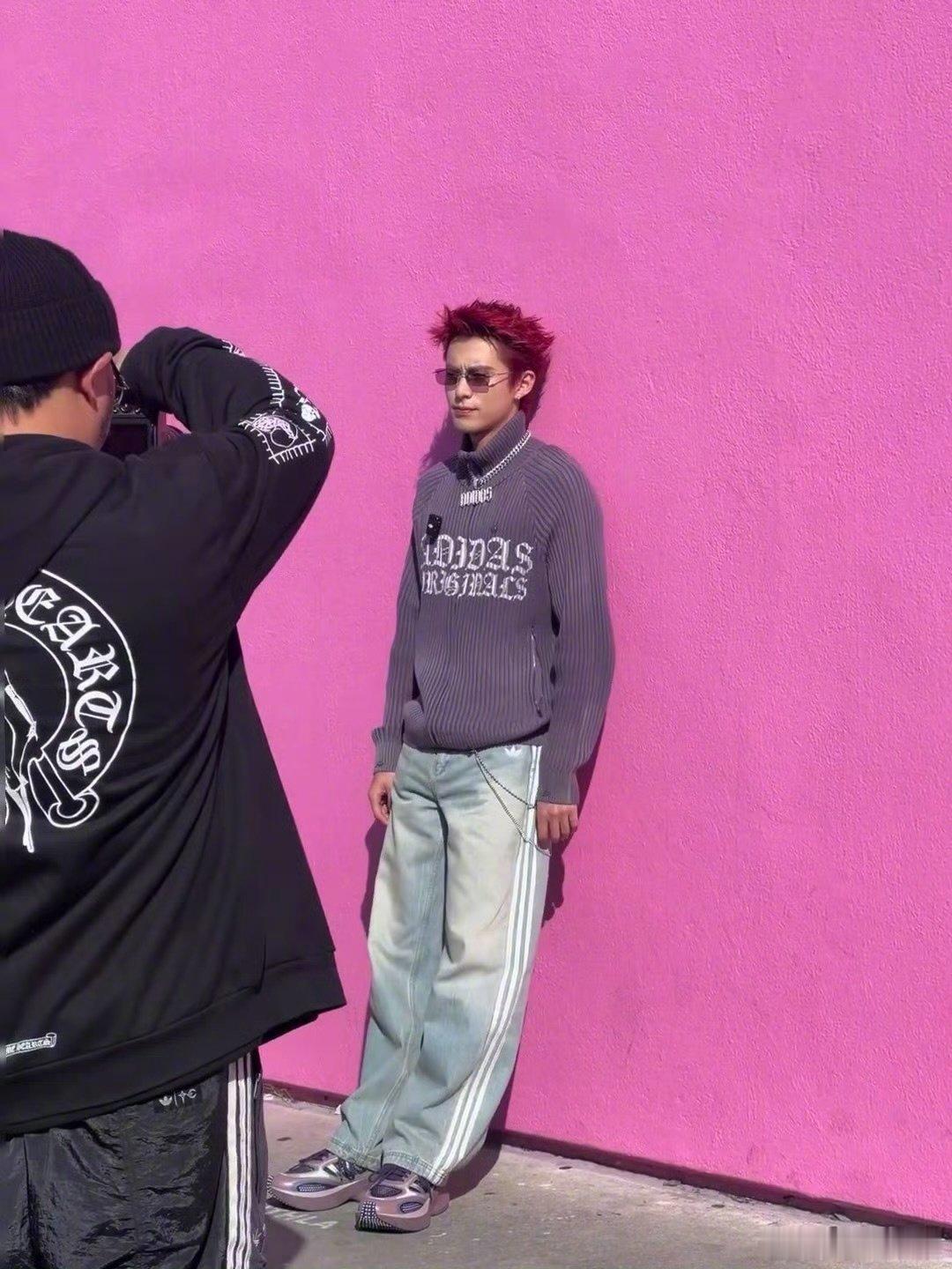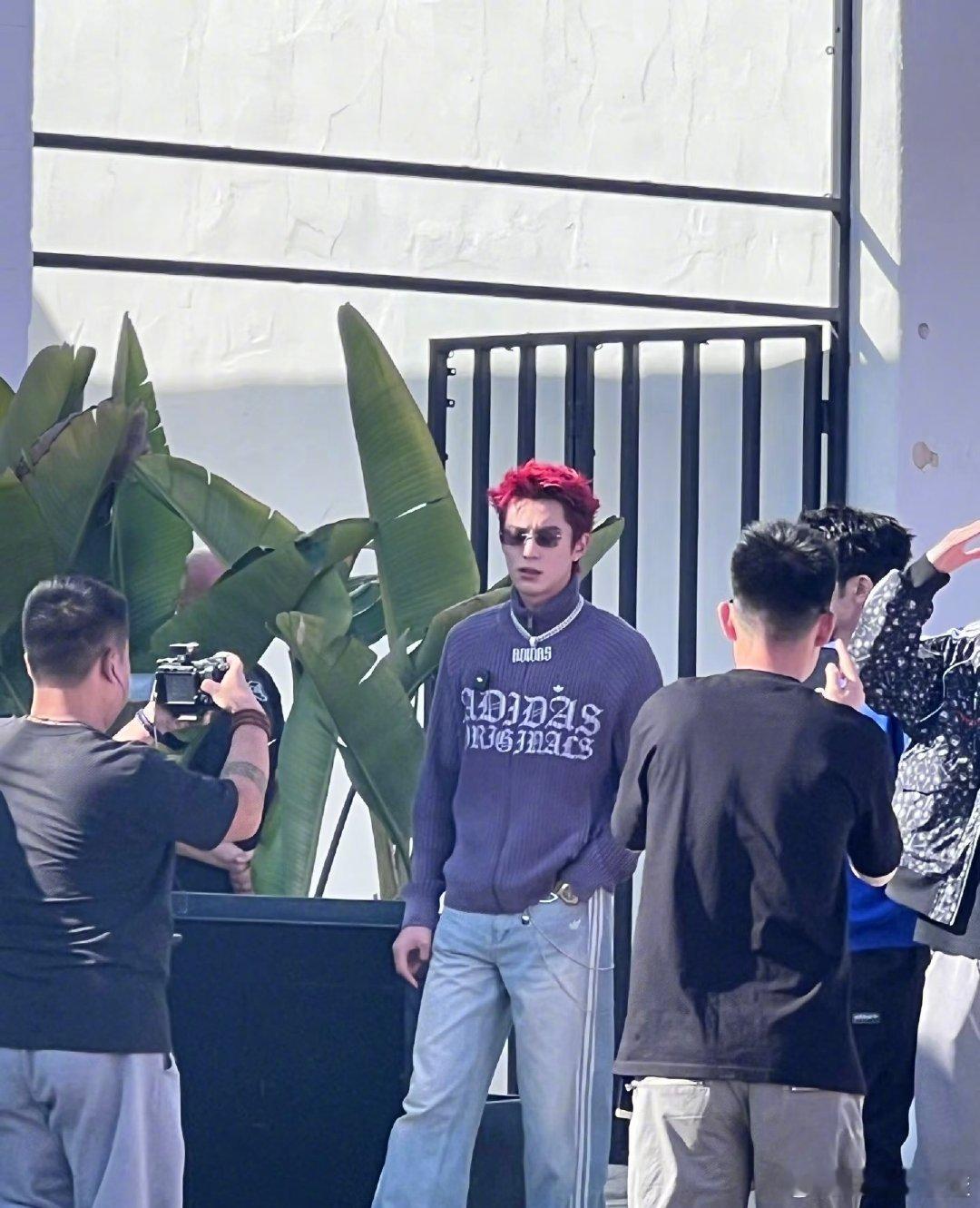洛杉矶偶遇王鹤棣拍摄 网友在洛杉矶街头偶遇王鹤棣拍摄,一头红发超帅的!
