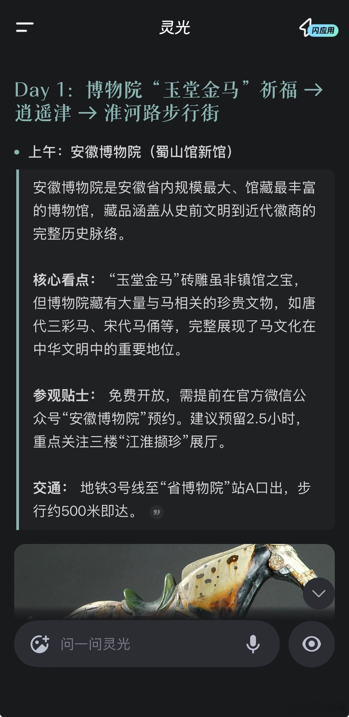 我的马年抓马之旅 马年求学业事业的小伙伴,一定要去安徽博物院看玉堂金马砖雕!用灵光搜完才知道,“玉堂金马” 在古代是翰林院的代称,妥妥的文运吉祥物,讲解超有梗,还帮我做了合肥的打卡攻略,新年去沾沾学霸运。 灵光带你去抓马