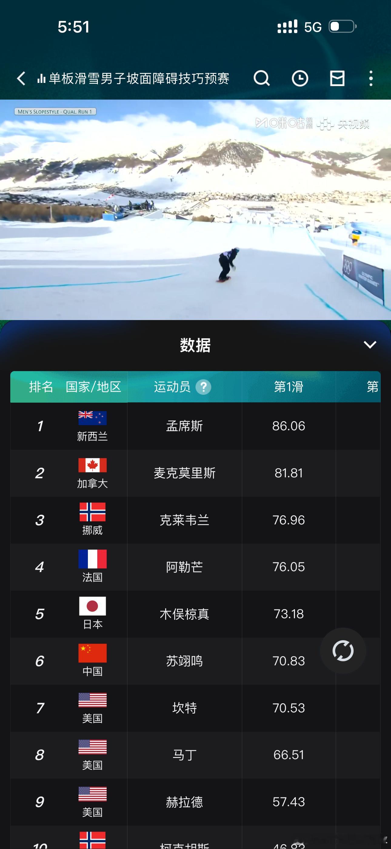 苏翊鸣第一滑稳健开局苏翊鸣第一滑70.83分