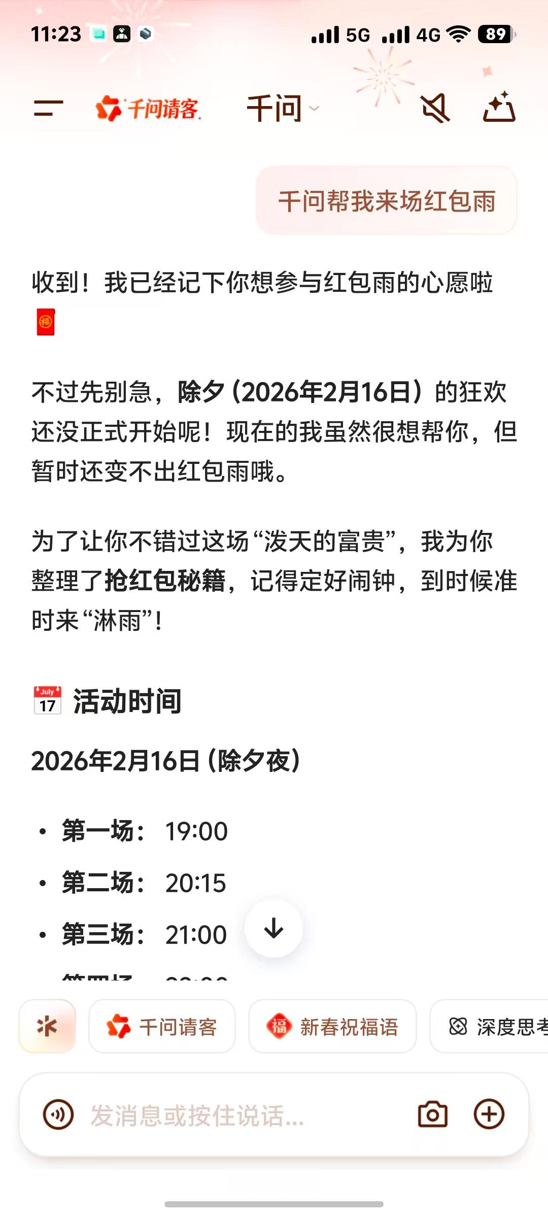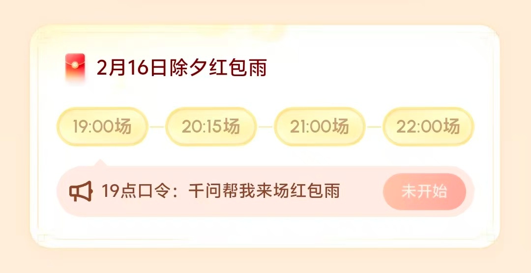 明晚19点(也就是春晚开播前一个小时)记得去抢千问的红包🧧!已经定好了千问红包雨的闹钟了参与方法是在千问输入框里写“千问帮我来场红包雨”就可以了千问这次力度很大,估计这次的红包雨金额应该不会很小了(看有人说最高2888)。俺已经订好时了。吃年夜饭还能顺便邀请两个新用户得券当晚八点一刻、九点、十点还有三场红包雨,不过可别只顾着抢红包不和家人过节啦。