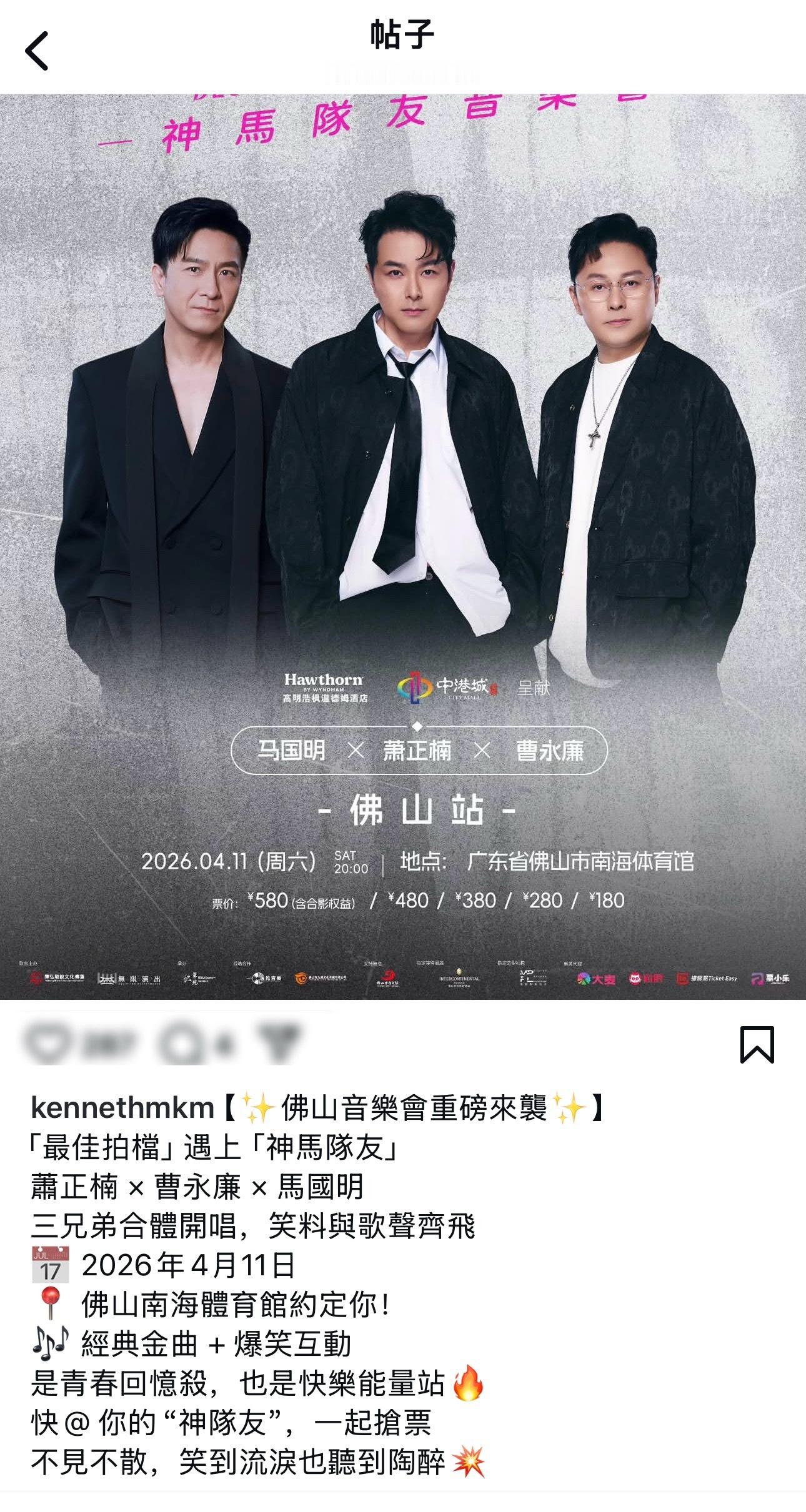 马国明、萧正楠、曹永廉合体开音乐会,580元票价含合影。