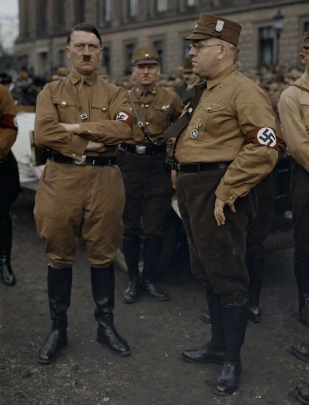 1932年7月,阿道夫·希特勒在参加德国不伦瑞克市纳粹党区域会议后的照片,那时他还不是元首。照片右侧侧身站立者为纳粹党早期成员安东·弗兰岑。 历史 历史老照片 二战