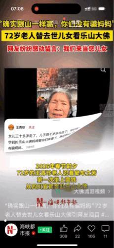 泪目,72岁的老人,在孙媳妇陪伴下首次走出农村,在乐山大佛前,坚持自己拍下视频,含着眼泪对着镜头告诉去世的儿女说:“和课本上说的一样高,你们没有骗我。” 老人今年已经72岁了,她一生都守在农村,原本也有一个幸福的家庭,儿女双全,夫妻和睦,她用勤劳的双手托起着全家的幸福。 然而,命运却对她格外残忍:她的女儿三十多岁的时候,生了一场大病,这场大病几乎让她耗尽了家财,却仍无法留住女儿的命。 和女儿阴阳相隔的最初那段时光,她非常悲痛,但好在有家人的陪伴,她也慢慢地从伤痛之中走出来。 可命运好像不愿放过她,时隔几年,她的儿子也不幸离世,儿子的离世,让老人更加悲伤,她不愿在外人面前提前孩子,把这份思念深深地藏在了心底。 今年,她的孙媳妇接她去城里过年,老人向孙媳妇吐露了心里的愿望:儿子在小时候读书时,知道了乐山大佛,说大佛很高很大,像山一样,而且 就在四川,说等他长大了就带妈妈去看看,现在儿子不在了,她想替儿子去看看大佛。 面对这个小小的心愿,孙媳妇二话不说,马上就安排好,并且全程陪着奶奶。 这是奶奶第一次走出农村,更是第一次高铁,虽然一路上晕车难受,可她脸上一直挂着笑。她想这是在陪儿女完成遗愿。 站在乐山大佛脚下,看着这座巍峨的佛像,老人举着手机,对着镜头轻声说: “你们初中课本上学的乐山大佛,妈妈替你们来看了,确实跟山一样高,你们没有骗妈妈。” 一句话,瞬间看哭无数人。 网友们纷纷留言:我们来当您的儿女,愿您余生平安。 看完大佛,老人还说,儿子说过天安门很美,他说过的地方,我都想去。 这趟迟来的旅行,装着最深的思念,也藏着最暖的陪伴。愿奶奶身体健康 取材网络,侵删,个人观点,仅供参考。