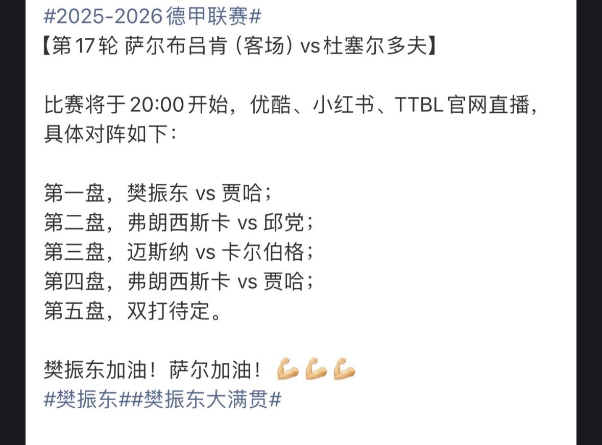 2月15日樊振东德甲一如既往慢热3:1贾哈 ——赵子豪真兄弟👬振臂高呼 德甲第十七轮比赛, 萨尔布吕肯VS杜塞尔多夫, 第一盘樊振东3:1贾哈, 6:11,11:8,11:6,11:9 樊振东一如既往的慢热, 看得我心惊肉跳, 特别是欧冠1/4比赛中 输温瑞博,输西蒙高茨, 虽然有原因, 但还是希望樊振东赢! 我看的是赵子豪的直播间, 赵子豪解说的非常好👍, 当樊振东落后的时候, 赵子豪对网友说别着急, 弄的我都出汗啦! 第二局樊振东8:4领先, 贾哈追分至8:8, 空气都快窒息啦, 樊振东关键分处理的绝了, 连得三分,11:8扳回一局! 第三局,樊振东的节奏打出来啦, 一直领先对方两分,11:6, 樊振东再得一分,大比分2:1 领先! 第四局,樊振东一度打到5:5,6:6, 依然紧张😓,东哥不负众望11:9拿下比赛! 获胜那一刻,赵子豪在直播间 振臂高呼,太开心, 太高兴啦,赵子豪是东哥的真 兄弟啊! 恭喜樊振东今天二单拿下比赛, 祝东哥在异国他乡春节快乐, 健康平安!