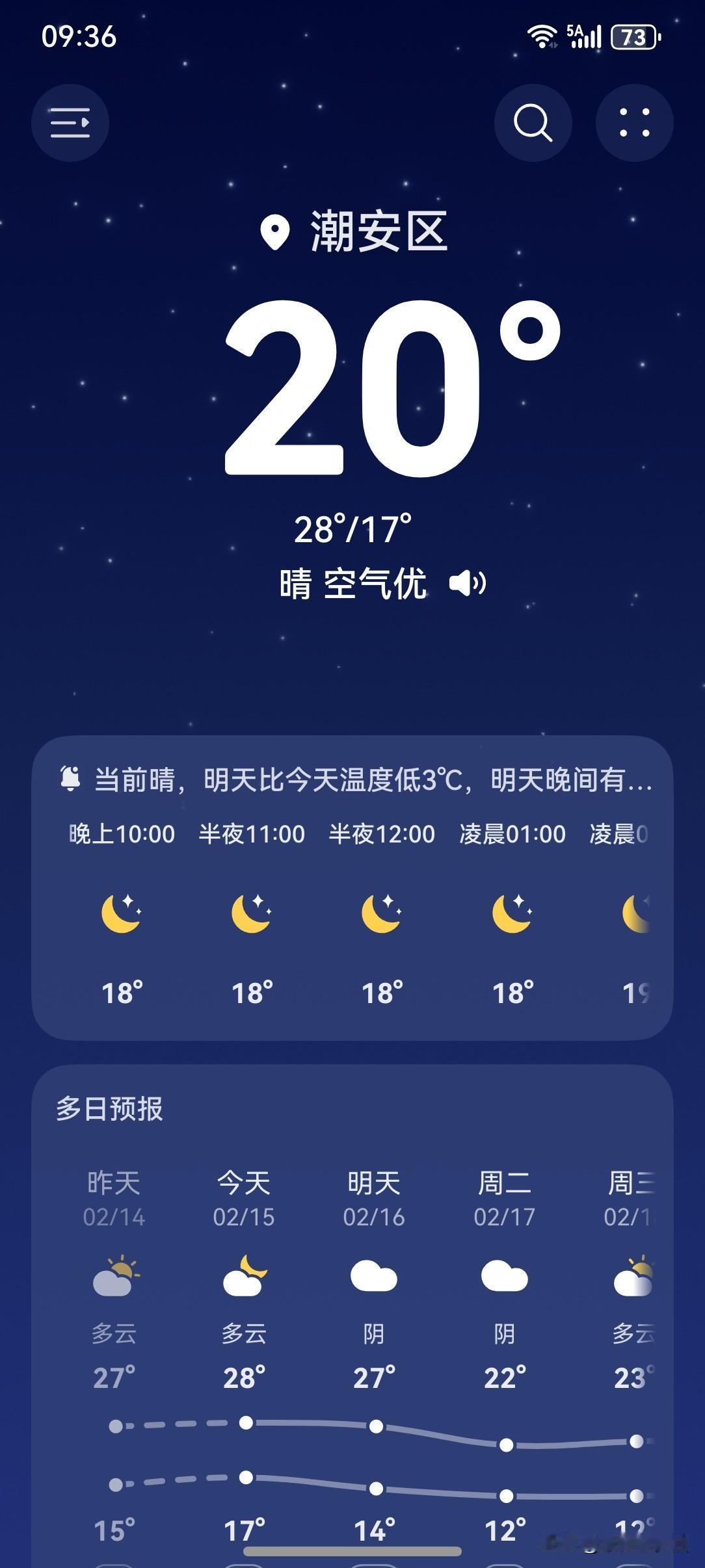明日除夕,广东冷空气将陪大家跨年啦~ 16日白天冷空气影响粤北,夜间影响中南部。16~18日粤北下降6~8℃,其余市县下降3~5C。 年廿八,洗邋遢。今天(15日)是春节假期第一天,广东迎来阳光满屏,气温飙升到30℃,确实是个晾晒的好天气啊! 今天(15日),潮州喜提一个多云天气,气温17~28℃,此刻气温20℃,体感温度22℃。 春节前遇到28℃的天气,确实是难以预料啊!许多小伙伴都热懵了,顶着28℃的天气大扫除,汗流浃背啊! 明天的气温会下降一点点,但不多,只有1℃!这……降与不降有何区别呢?还得坐等冷空气的到来吧! 天气热得有点异常,总感觉有点晕乎乎的!这个时候应该来上一波降温会好一些! 作为一个向来怕冷的人,竟然从未如此期待冷空气的到来! 明天冷空气将率先抵达粤北地区,其它地区的小伙伴们,还能继续暖和一天半天的。 [我想静静][捂脸][笑哭][大笑][我想静静][捂脸][笑哭][大笑]