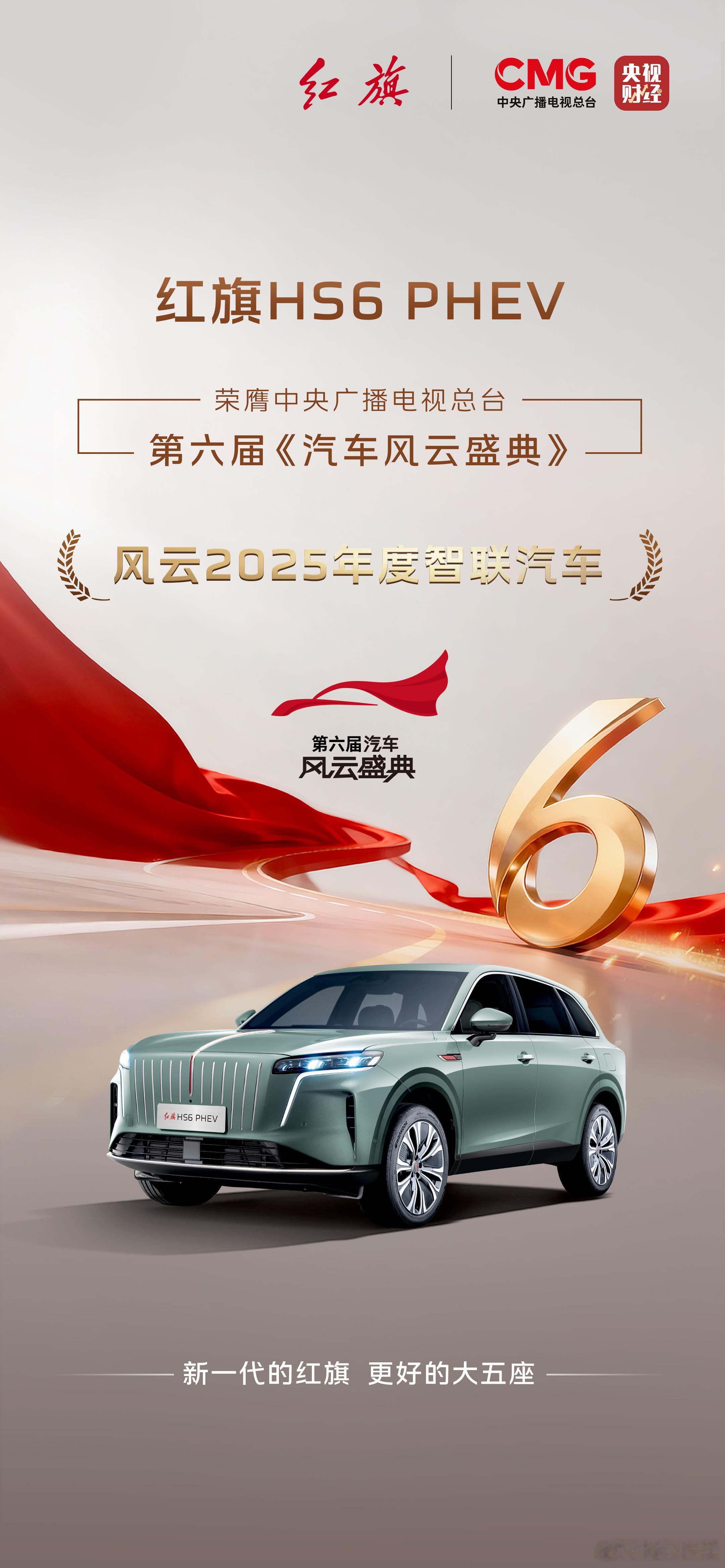红旗HS6 PHEV荣膺央视第六届汽车风云盛典风云2025年度智联汽车智慧领航,每一程都安心抵达新一代的红旗&更好的大五座