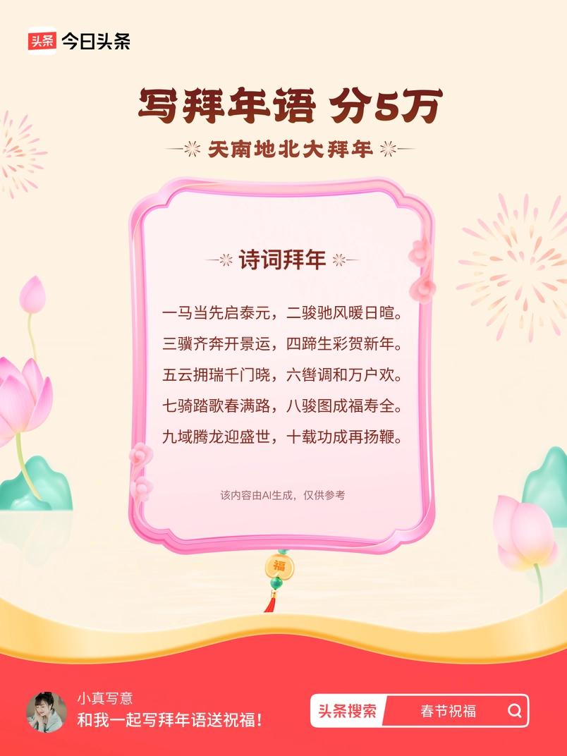 写拜年语送祝福新春拜年送祝福!我的祝福是:“一马当先启泰元,二骏驰风暖日暄。三骥齐奔开景运,四蹄生彩贺新年。五云拥瑞千门晓,六辔调和万户欢。七骑踏歌春满路,八骏图成福寿全。九域腾龙迎盛世,十载功成再扬鞭。”!快来一起写祝福吧戳这里,一起领红包>