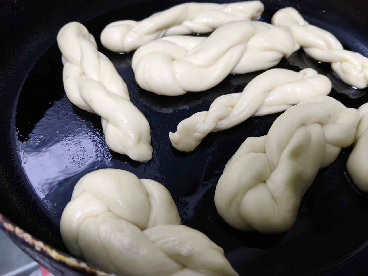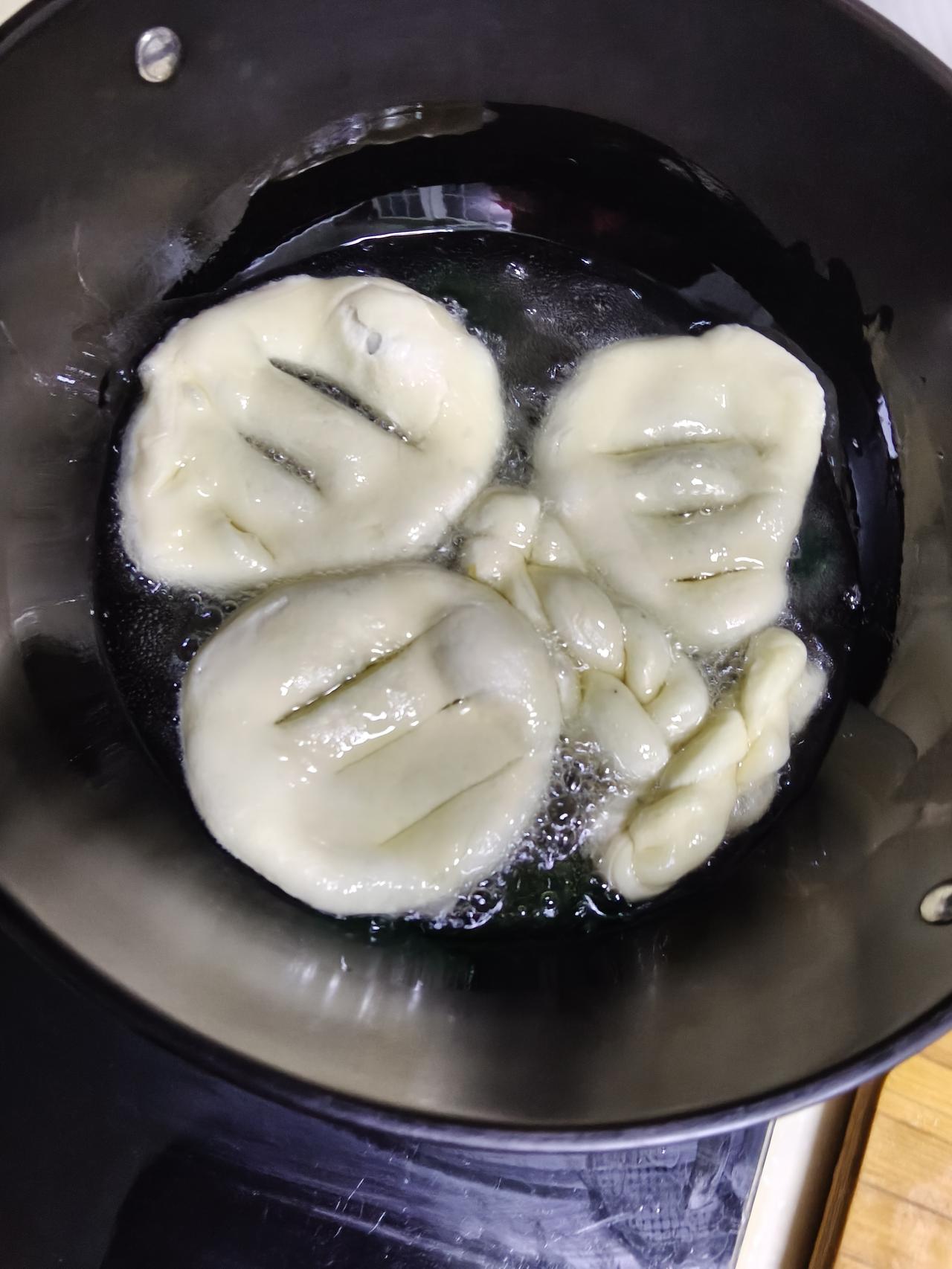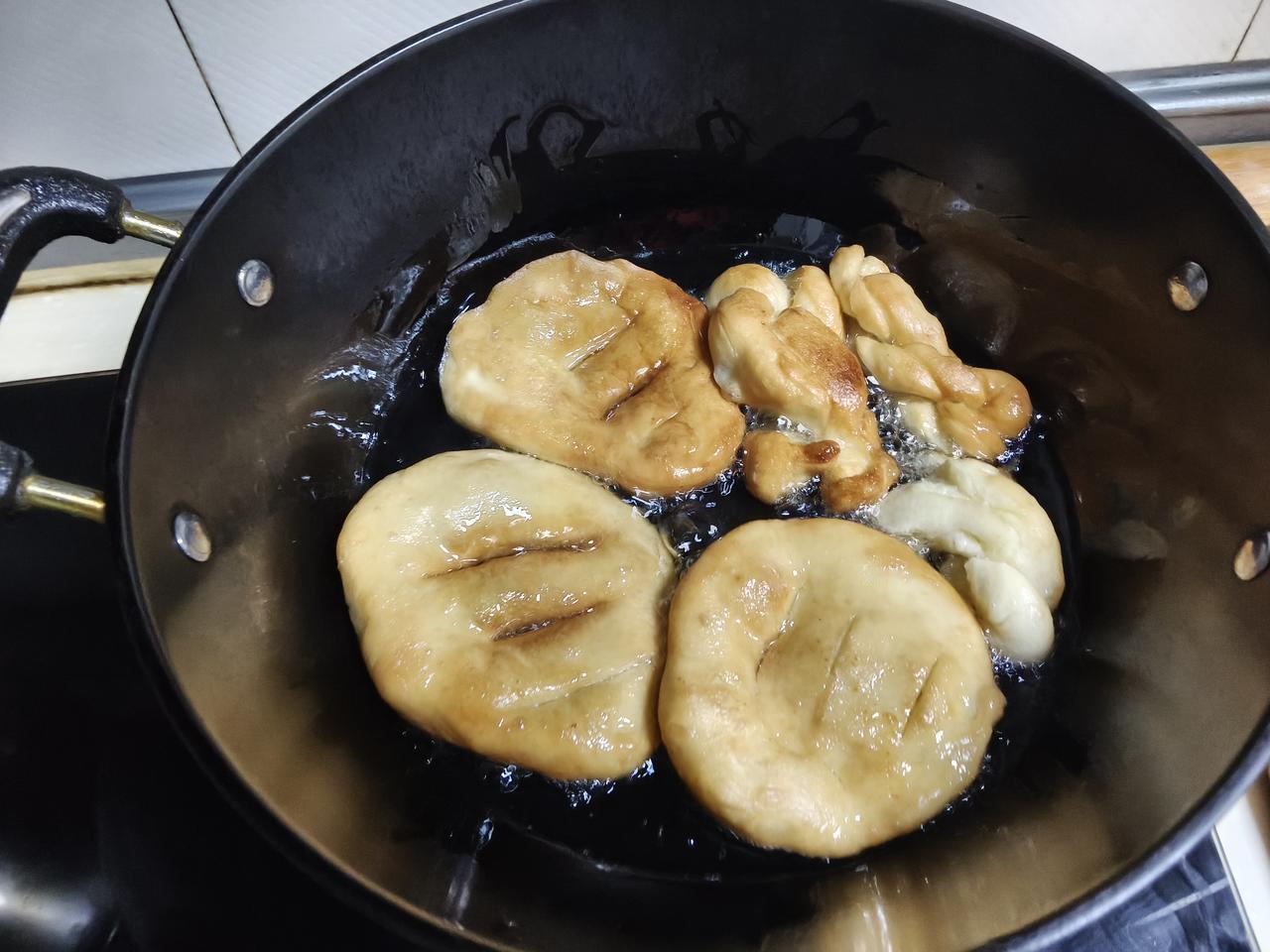 本来今天早上已经把炸油饼和麻花儿的面已经和好了,今天下午看着面醒发的非常的好。 每年炸油饼和老公都是这样分工的,一个人负责在锅跟前炸,另外一个人负责擀油饼或者做麻花儿。 正准备开工的时候,婆婆打来电话,说他身体不舒服,主要是头昏的厉害,老公赶紧。出门去看老人家到底是啥情况,结果婆婆血压高压直奔190。 这一走炸油饼和麻花的任务就落在我一个人的身上,一个人手忙脚乱。 又是擀造型又是负责在锅跟前油炸,然后把我一个人忙的不亦乐乎。 最后好在把过压油炸麻花和油饼的任务完成了,一个人干活不容易。 新年来了!