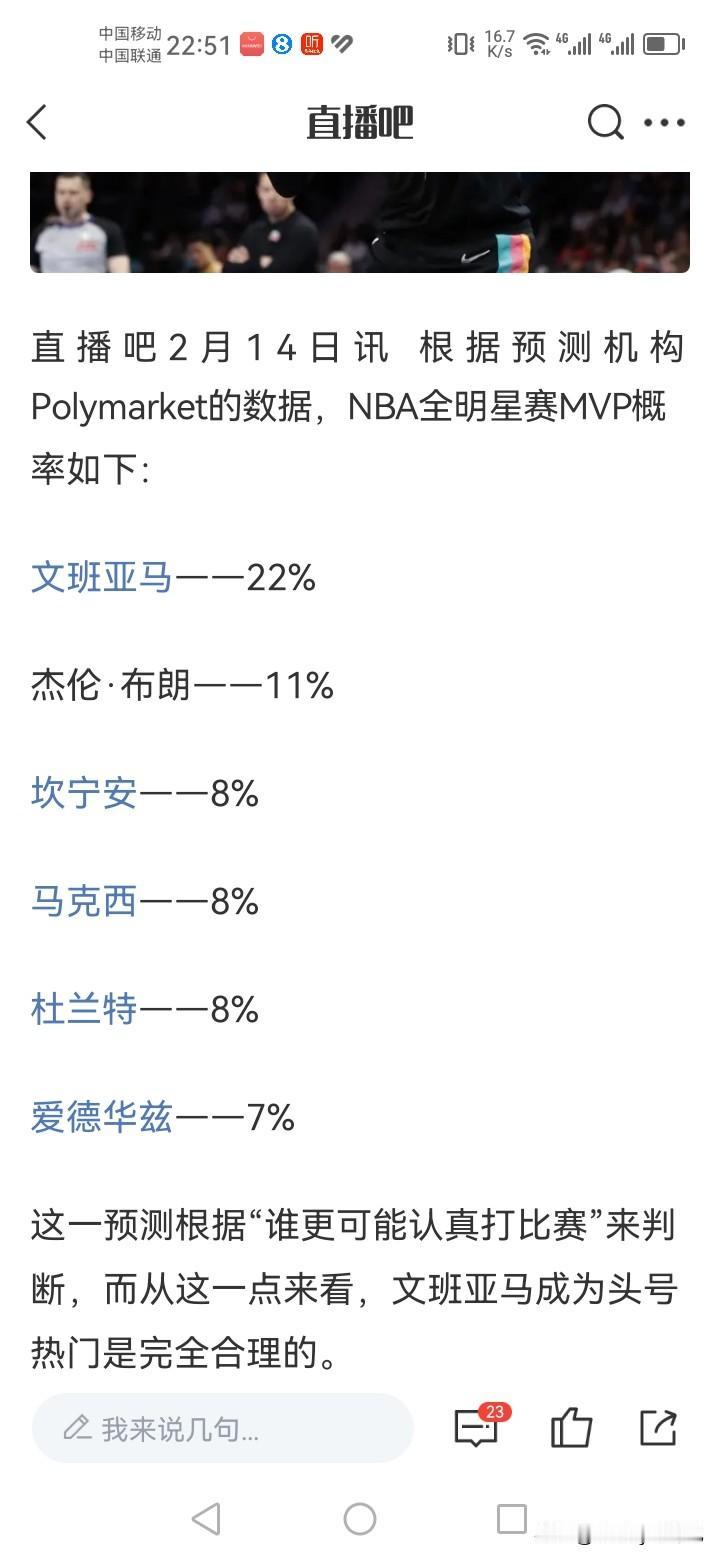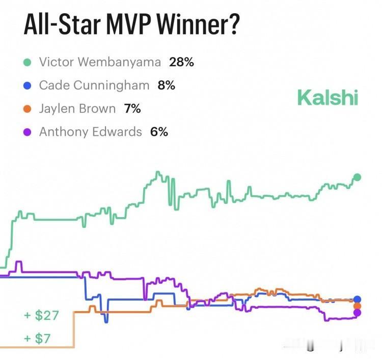 全明星正赛明天将进行,文班亚马将夺MVP? Ploymarket这个预测机构说,文班有22%的概率拿MVP断档领先,布朗、坎宁安和马克西紧随其后。 竞猜平台KalshiSports刚才说,文班亚马 有28%的概率拿下MVP。 同时被两大机构看好,难道真的准? 我看好伦纳德 或者杜兰特 拿下MVP。