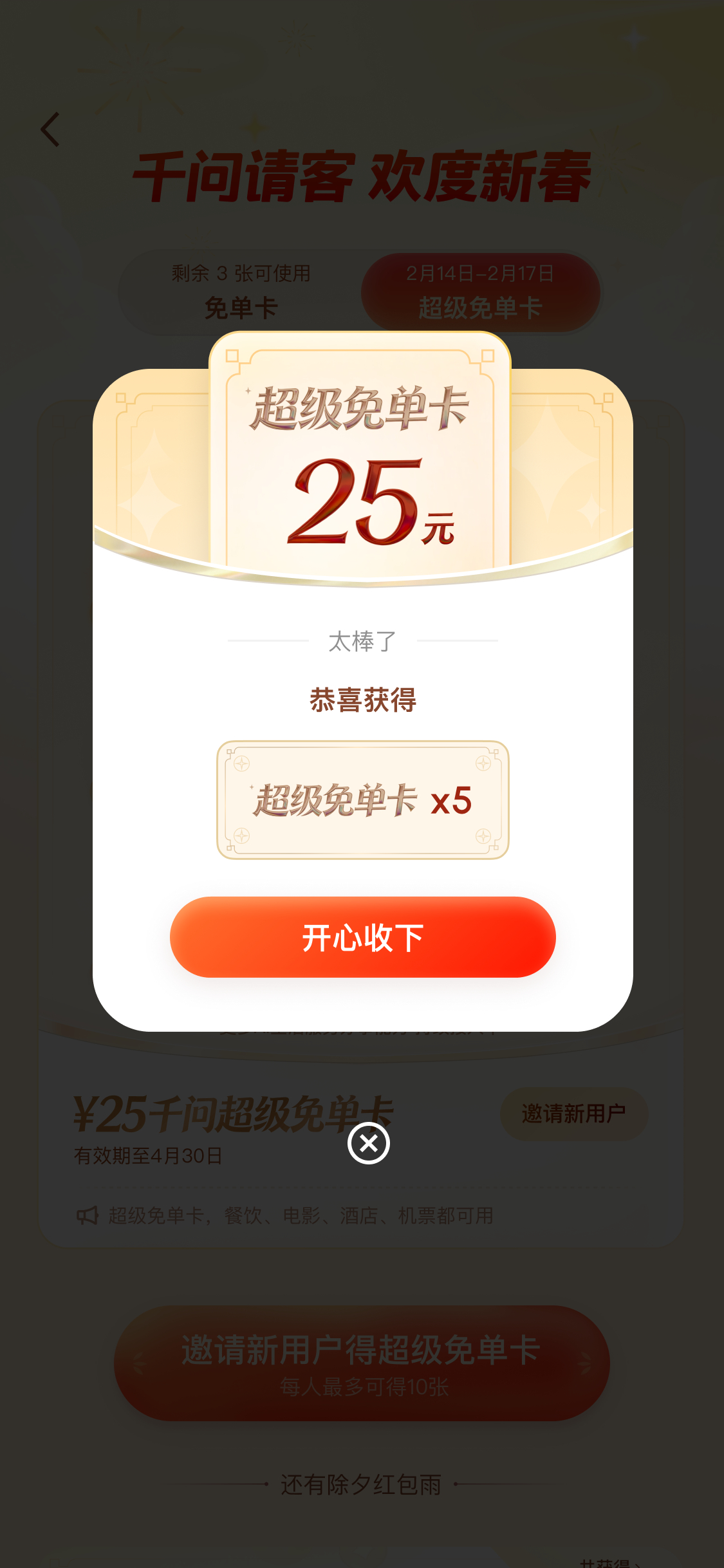春晚的神喊你上千问领整点红包雨 千玺的福利让我支棱起来了!谁能想到新年的第一个红包是千玺给的,千问你真的懂我,粉丝呜呜呜好开心!而且除夕夜19~22点还有整点红包雨,千问这波好感度拉满,还有25元超级免单卡,我打算用25元超级免单卡买惊蛰无声电影票,嘿嘿,多囤几张,拉上我妹一起看。