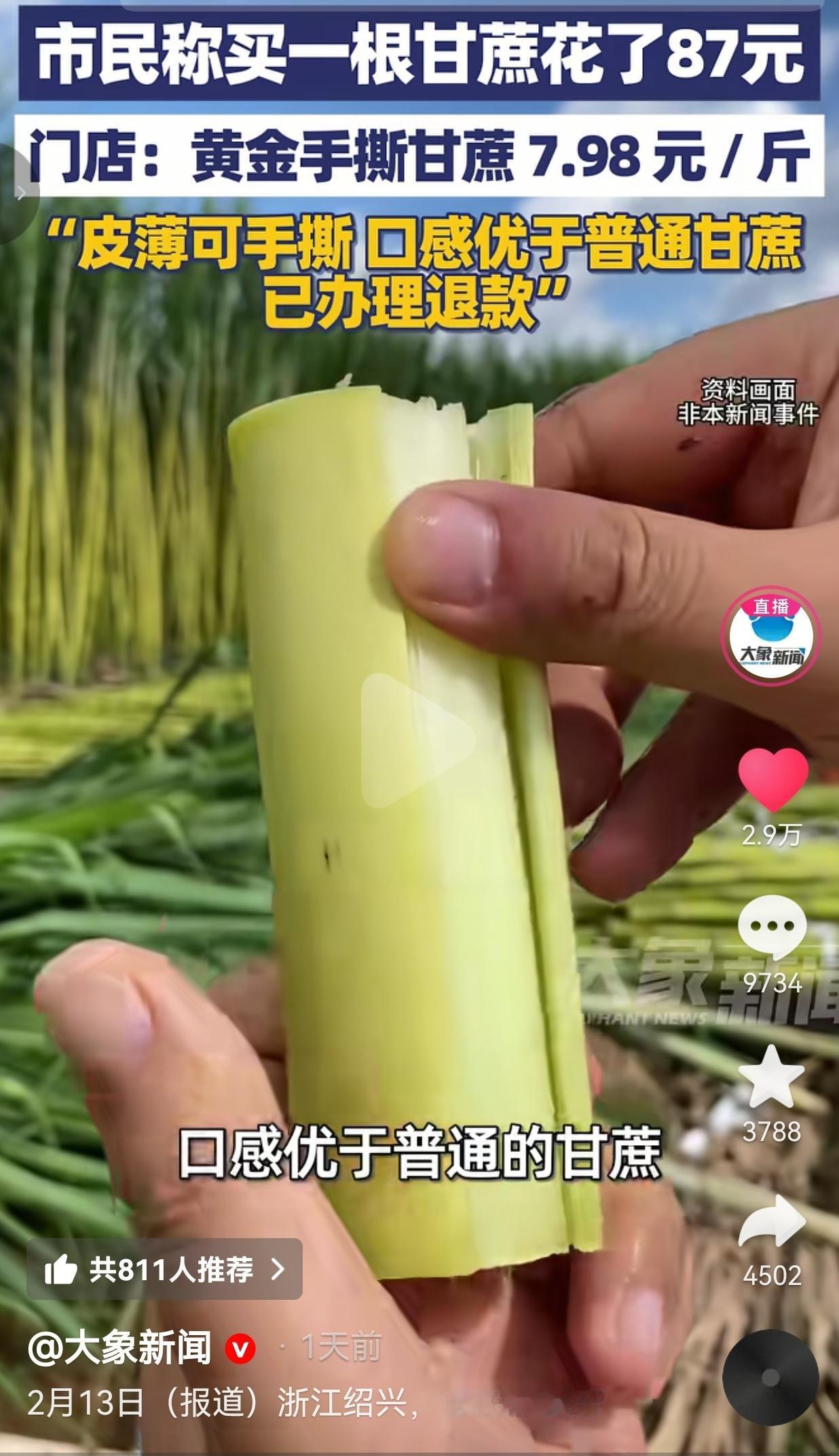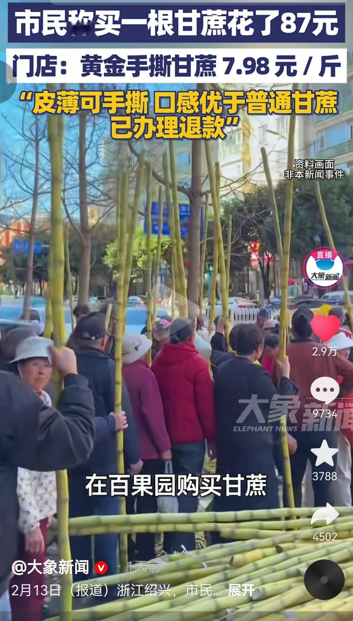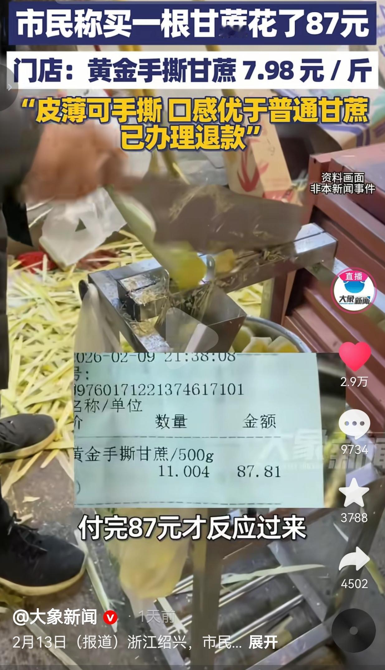 近日,浙江绍兴一市民,在百果园买了一根甘蔗,结账时一看账单,彻底懵了,上面清清楚楚地写着:87.81元。 一开始,他还以为自己看错了价格。可是,再仔细一看,小票上写着:黄金手撕甘蔗,7.98元/斤,这根重11.004斤。 门店后来回应了,说这不是普通甘蔗,是“黄金手撕甘蔗”,皮薄能手撕,口感比普通的好,所以贵。 员工还说,当时已经明确告知了价格,也现场手撕展示了果肉,可能是顾客误以为和普通青皮甘蔗一个价,买完才发现贵了,心里有落差。 目前门店已经为当事人办理了退款,此事已妥善解决。 说真的,看完这个视频,我的第一反应是:这哪是甘蔗啊,这简直是“镶金边的木头”。 我小时候在老家,村口卖甘蔗的大爷,一捆一捆堆在地上,5块钱一根,还帮你削得干干净净,切成小段装袋。那时候觉得,甘蔗就是冬天里最甜的快乐,便宜又实在。 可现在呢?连个甘蔗都能玩出花来。 “黄金手撕”“皮薄易剥”“口感升级”……这些词儿一套一套的,听着就高级。可剥开那层华丽的包装,不还是那根甜水儿吗? 我不是说不能卖贵的东西,可一根甘蔗卖到快90块,这价格,真的配得上它的价值吗? 这事儿在网上炸了锅,有的网友说: “7.98一斤?我买的排骨才18一斤,这甘蔗比肉还金贵。” 也有的网友说:“商家是不是对‘黄金’有什么误解?我看这是‘智商税’吧。” 还有的网友说:“我上次买了根差不多重的,才20多块,这87块的,吃了能成仙吗?” 其实,大家吐槽的,不只是这根甘蔗。我们吐槽的是,现在好多东西,都在变着法儿地溢价。 比如一杯奶茶能卖30多,一个面包能卖20多,连个甘蔗都能卖到近百块。 我们的钱包,好像成了商家眼里的“唐僧肉”,谁都想来咬一口。 我想起前阵子看到的一句话:“当商品开始贩卖‘概念’,我们就离生活的本质越来越远了。” 商家总在告诉我们,要追求更好的生活,要吃更高级的东西,要用更有格调的产品。可他们没告诉我们,这些“更好”,往往是用我们的血汗钱堆出来的。 我们辛辛苦苦赚的钱,不是大风刮来的。我们买的每一样东西,都应该是物有所值,而不是为那些虚无缥缈的“概念”买单。 这根87块的甘蔗,就像一面镜子,照出了我们这个时代的浮躁。 我们总在追逐那些看起来光鲜亮丽的东西,却忘了,生活最本真的快乐,其实就藏在那些朴素、实在的小事里。比如一碗10块钱的面,一句家人的问候。 大家觉得呢?欢迎评论区唠唠。