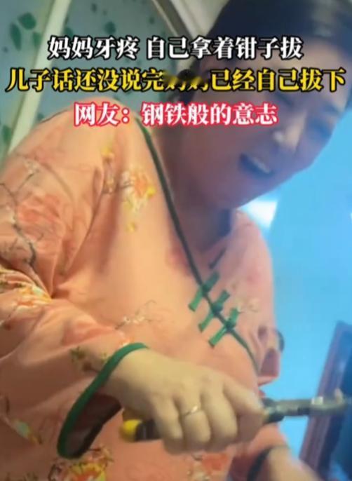 长痛不如短痛,是个狠人! 一妈妈牙疼,自己拿着钳子拔,儿子话还没说完,妈妈已经自己拔下了。儿子惊讶地说不出话,妈妈淡定搁那笑。 真狠,对自己能下得去手!不过,这一拔,怒省好几百,拔牙也老贵的。 这么轻而易举拔下来,说明已经很松了,要掉不掉的那种。但是这钳子消毒了吗?牙龈消炎了吗?别因小失大,事后发烧就好。 专业的事情还是交给专业的人,比较放心!毕竟生命健康最重要!