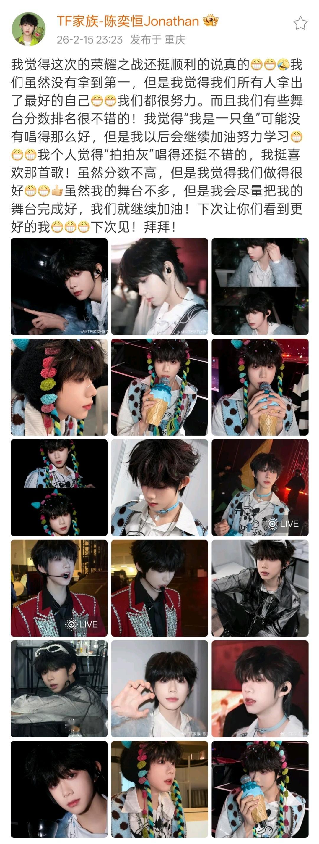 陈奕恒荣耀之战总结文陈奕恒荣耀之战十八宫格总结 陈奕恒更新,发了荣耀之战十八宫格总结,更好的舞台见吧!!陈奕恒粉丝道歉信