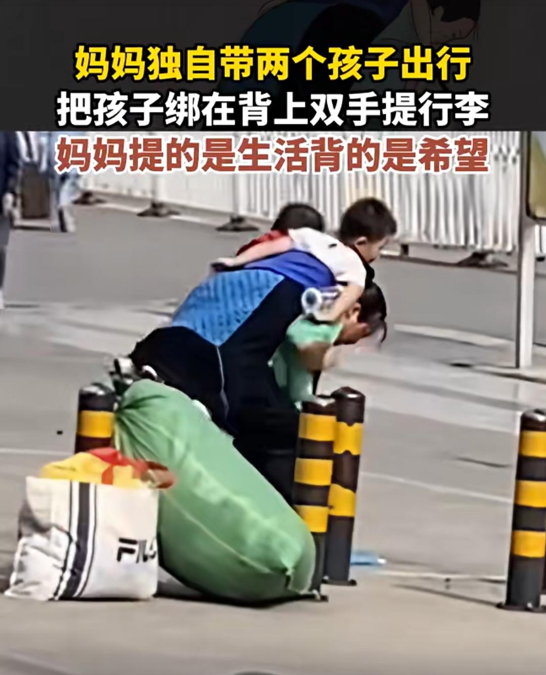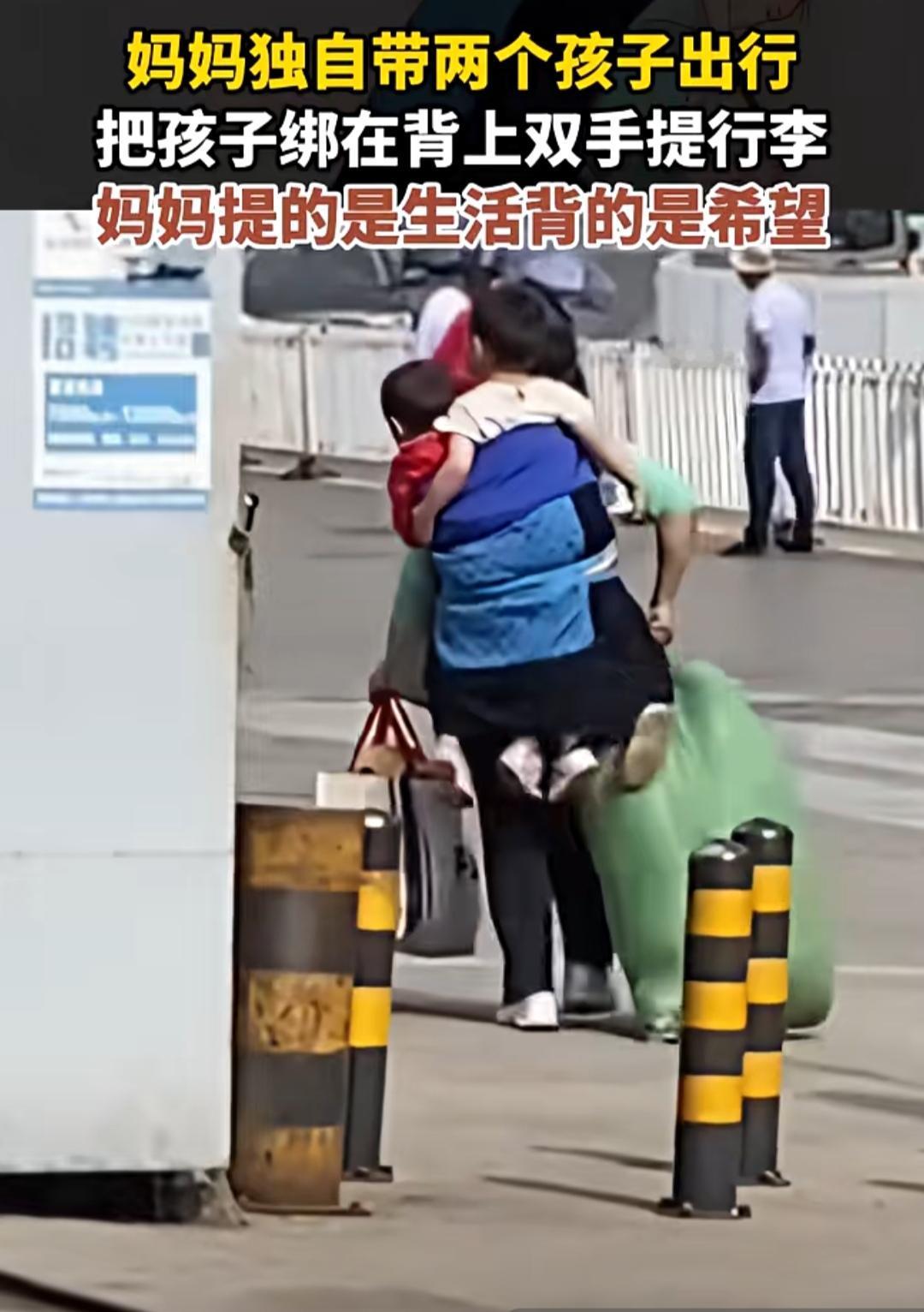在车站的人潮里,我们常常能看到无数为生活奔波的身影,但有一个画面,却像一根针,轻轻扎进了每个人心里最柔软的地方。 一位年轻的妈妈,独自带着两个年幼的孩子出行。没有家人的陪伴,没有搭把手的帮手,她把两个孩子牢牢绑在自己背上,腾出双手,提起了几个鼓鼓囊囊的大行李包。她的身影在人群中显得格外单薄,却又无比坚定。 这一幕被路人拍下后,迅速在网络上刷屏。配文“妈妈提的是生活,背的是希望”,瞬间击中了无数人。 有人说,看到她,就想起了自己独自带娃的日子。在那些兵荒马乱的时刻,一手抱娃一手提菜,在地铁上被挤得东倒西歪,在深夜里哄睡孩子后还要收拾一地狼藉。那些不为人知的疲惫和委屈,在这一刻,仿佛都被这个陌生的妈妈替自己说了出来。 也有人说,这哪里是一个女人,这分明是一个战士。她背上的孩子,是她的软肋,更是她的铠甲。为了他们,她可以爆发出连自己都难以置信的力量。她提的行李里,装着的是柴米油盐的琐碎,是对未来的规划;她背上的孩子,承载的是整个家庭的希望,是她愿意为之付出一切的光。 在这个快节奏的时代,我们总在歌颂英雄,却常常忽略了身边这些平凡的母亲。她们没有惊天动地的壮举,却在日复一日的琐碎里,用自己的肩膀扛起了整个家。她们的双手,既要提得起生活的重量,也要托得住孩子的未来。 这个妈妈的背影,让我们看到了母爱的伟大,也看到了无数女性在生活中默默承受的一切。她们是女儿,是妻子,更是了不起的妈妈。她们用自己的方式,在这个并不完美的世界里,努力地活着,温柔地爱着。 愿每一位负重前行的妈妈,都能被生活温柔以待。也愿我们,在看到这样的身影时,能多一份理解,多一份善意,多一份伸出援手的勇气。最坚强是妈妈 妈妈手提背包