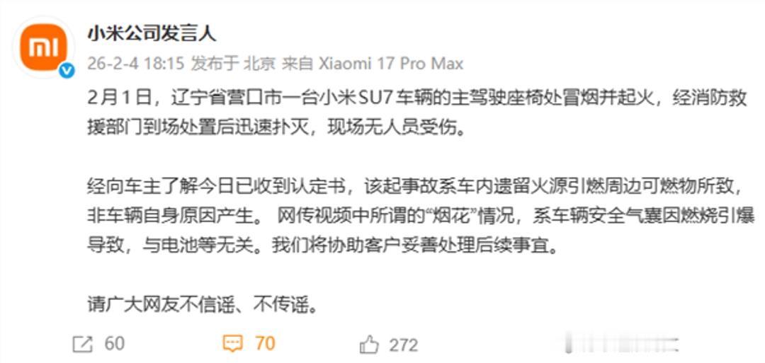 一个小小打火机,差点把一台小米SU7给“点天灯”了。 这事儿就发生在本月初,辽宁营口。一台SU7突然在主驾座着火,网上瞬间炸了锅,“电动车自燃”“充电爆炸”的帽子全扣上来,还有人说得更邪乎——现场放烟花了。 结果消防一纸认定书出来,剧情反转得让人哭笑不得:跟电池没半毛钱关系,罪魁祸首是个防风打火机。 这玩意儿不知道怎么就滑到座椅导轨里了,车主调节座椅的时候,硬生生把它给挤爆了。丁烷气泄漏,再被摩擦的热量点着,火苗子蹭地一下就起来了。更绝的是,火烧到安全气囊,气囊发生器里头那点推进剂被高温一激,直接来了场“露天表演”。所以网上传的“放烟花”,其实是气囊在演戏。 你品品这事儿,三十多万的车,全身高科技,最后差点让一个十几块的破打火机给毁了。上哪儿说理去? 有意思的是小米的反应。消防认定刚出来,转头就给所有车主群发短信:别在放烟花的地儿停车,车里别放打火机。措辞干巴巴的,像条普通提醒。但你要是知道前因后果,就明白这哪是温馨提示,这分明是一个大写的“冤”字——求求你们了,管好随身物件儿,别再让我们背锅了。 这事其实给所有车主提了个醒。咱们聊电车安全,天天盯着电池,什么刀片电池麒麟电池,好像电池不出事就是铜墙铁壁。结果呢?最容易出事的,恰恰是你顺手扔中控台那个打火机,夏天晒一天就是个雷。 一条短信看着简单,背后是活生生烧出来的一课。下次上车前,低头瞅瞅座椅缝儿吧。