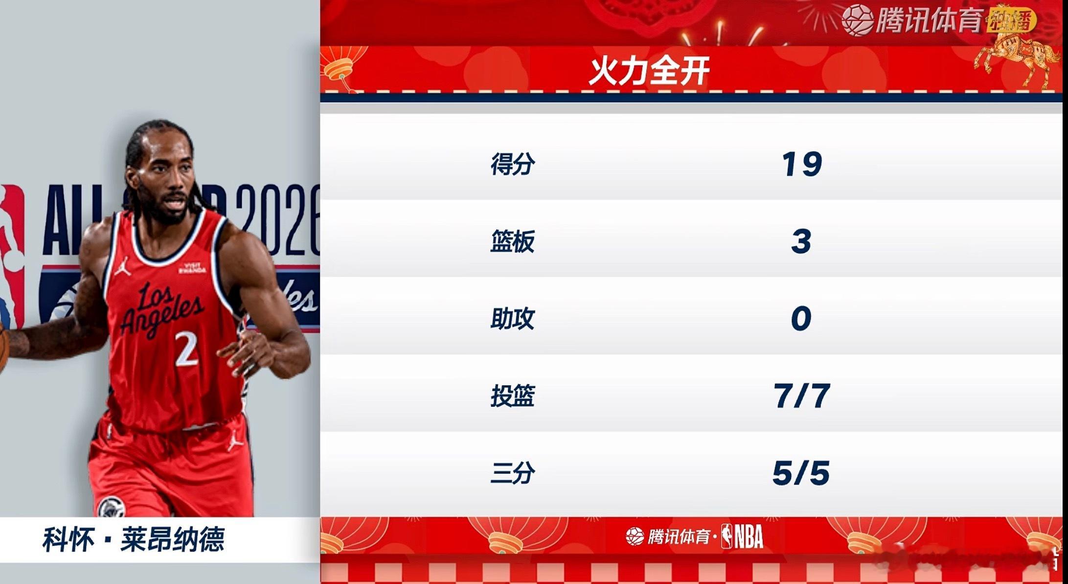 哇!科怀伦纳德!!!!!!! 连得11分,目前7中7,19分了!!! 2026nba全明星