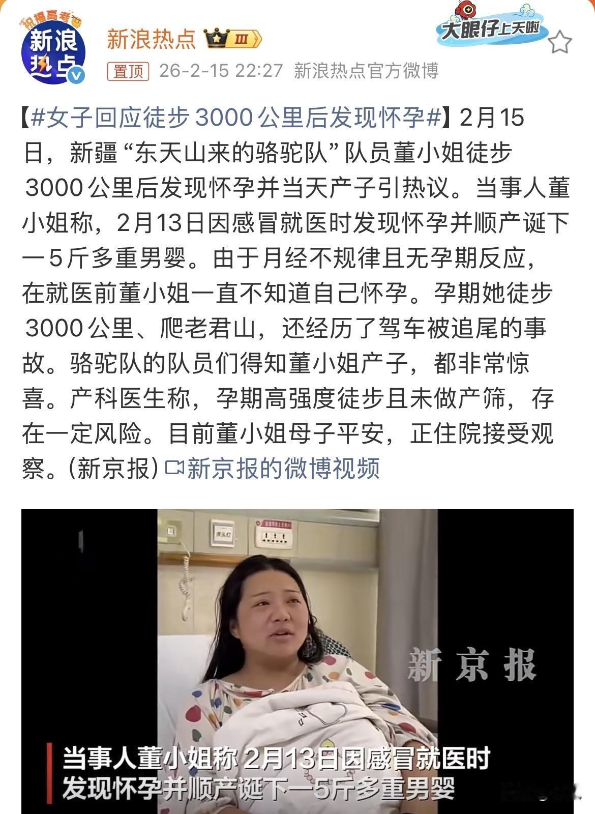 家人们谁懂啊,去医院看个感冒,结果抱了个娃出来。 2月13号,新疆的董小姐因为感冒进了医院。医生一看,说羊水都破了,宫口开了6指。 她当天顺产生下一个5斤多的男婴。从知道自己怀孕到生完,前后不到10个小时。 这事炸锅了。因为就在生孩子前几天,她还在徒步。 董小姐是“东天山来的骆驼队”队员,这个队去年9月从新疆哈密出发,徒步3000公里去河南洛阳。139天,走了四个月,她一步没落下。 路上还爬了老君山。开车被追尾过,安全气囊都弹出来了。 全程不知道自己肚子里有个人。 她说自己本来有多囊卵巢综合征,月经一直不规律。也没孕吐,只是觉得肚子大了点,以为是走长途吃得多,胖了。 整个孕期她没做过一次产检。 医生听完她的情况都捏把汗。产科医生说,孕期这么高强度徒步,还全程没做过筛查,风险太大了。 但孩子扛住了。 5斤多重,因为早产了一个月,现在还在保温箱里。检查了好几项,都正常。 她说这孩子是“福宝宝”。被追尾那次气囊都炸了,人没事。走那么远的路,爬那么高的山,他愣是一声不吭。 骆驼队的队友们听说她在医院生娃,全懵了。一起走了四个月,谁也不知道队伍里有个孕妇。 她自己也懵。本来是去看感冒的。 现在她在医院躺着,孩子在保温箱里睡着。她说这话的时候语气挺平静,像是在讲别人的事。 网上吵翻了。有人说这是命大,换个人早出事了。有人说这叫无知者无畏,拿命开玩笑。还有人说这也太离谱了,怀胎十月一点感觉都没有? 她说自己确实没感觉。以为是胖了。 这大概是最离谱的“胖了”。胖了30多斤,走了3000公里,爬了一座山,经历一次车祸,最后到医院才知道,那不是肉,是个孩子。 母子平安是万幸。但仔细想想,这一路但凡出一点岔子,都是大事。 你说这是福大命大,还是太不当回事了。 怎么看。