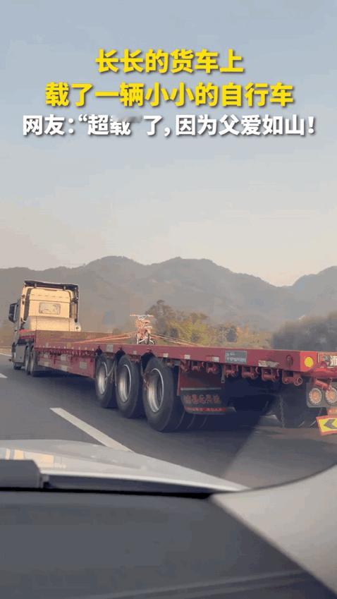 看得人热泪盈眶,这视频都火到新华社了。 2月13日,重庆铜陵高速公路上,一辆长长的货车里仅装着一辆小小的粉红色童车。为防止它磕碰到,这辆童车被许多绳子牵拉着,好似拉着最为重要的货物。 对此,有网友模拟交警与司机的对话:“交警:‘师傅,你超载了。’司机:‘怎么可能呢。’交警:‘你的爱超载,罚你一路平安,一生幸福……’” 还有网友说:“师傅在向全世界炫耀:他有个心尖尖上的小公主。” 这辆空空的货车上拉的哪是自行车,分明是一位父亲对女儿的爱与承诺,是女儿对父亲的期盼与等待。祝您一路平安。 (动图来源网络)
