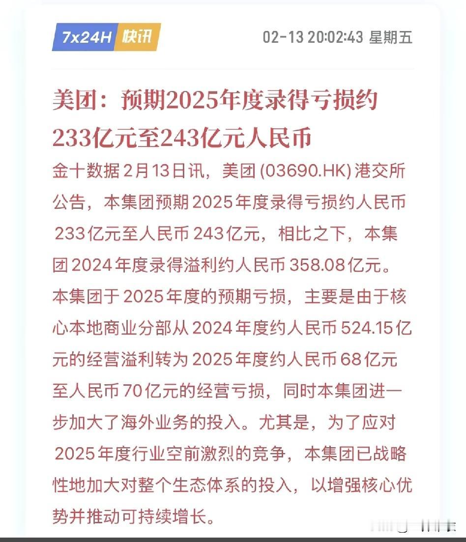 之前都说美团“护城河”高, 美团进军本地生活,打造即时零售(小象超市), 京东率先发力“围魏救赵”,京东外卖入局,为线上电商引流。 阿里随后参战,淘宝闪购加入战局,各种补贴。 到现在,才发现什么护城河,客户哪里补贴多,去哪里点外卖。 美团主业被围攻,本地团购又被抖音压着打。 亏损也就是显而易见的了。 (中间有个被大家忽略的点,2026年腾讯清仓自己持有的美团股份)