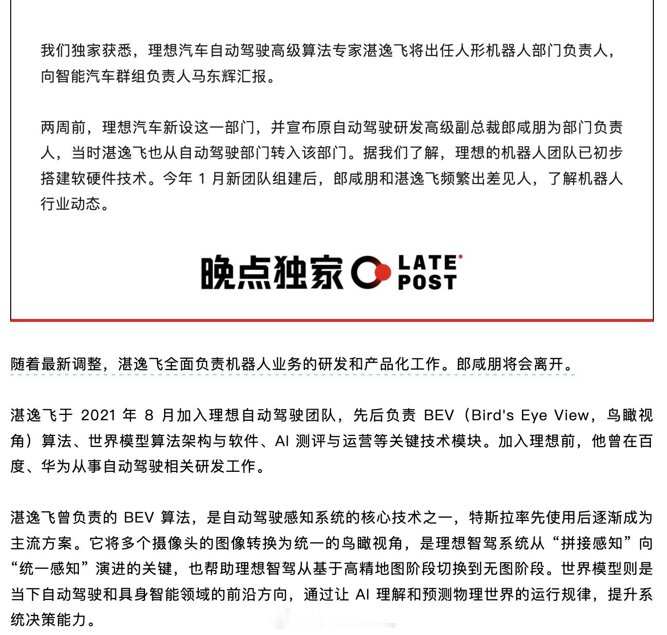 湛逸飞于 2021 年加入理想,长期负责 BEV 算法、世界模型算法架构与软件、AI 测评与运营等核心模块。在加入理想之前,他曾在百度、华为从事自动驾驶研发工作,负责的 BEV 感知方案和世界模型方向,是理想从“拼接感知”走向“统一感知”、从有图到无图的重要技术基础。理想对自动驾驶相关组织进行了拆分和重组,新设人形机器人部门。具身智能和人形机器人将是重要的下一阶段方向。