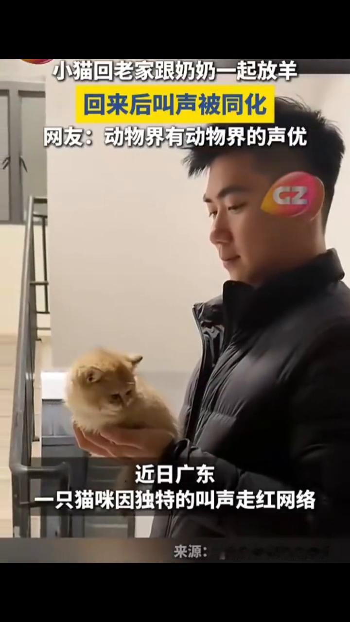 回老家一个月后,广东这只猫咪叫声像羊。网友:留"羊"回来的小猫回老家跟奶奶一起放羊,回来后叫声被同化。网友:动物界有动物界的声优。 近日广东,一只猫咪因独特的叫声走红网络。这只小猫回老家待了一个月,每天跟着放羊,结果连叫声都被"同化",变得羊里羊气的,可爱的模样逗乐了不少网友。《羊教版小咪》,动物界有动物界的声优。