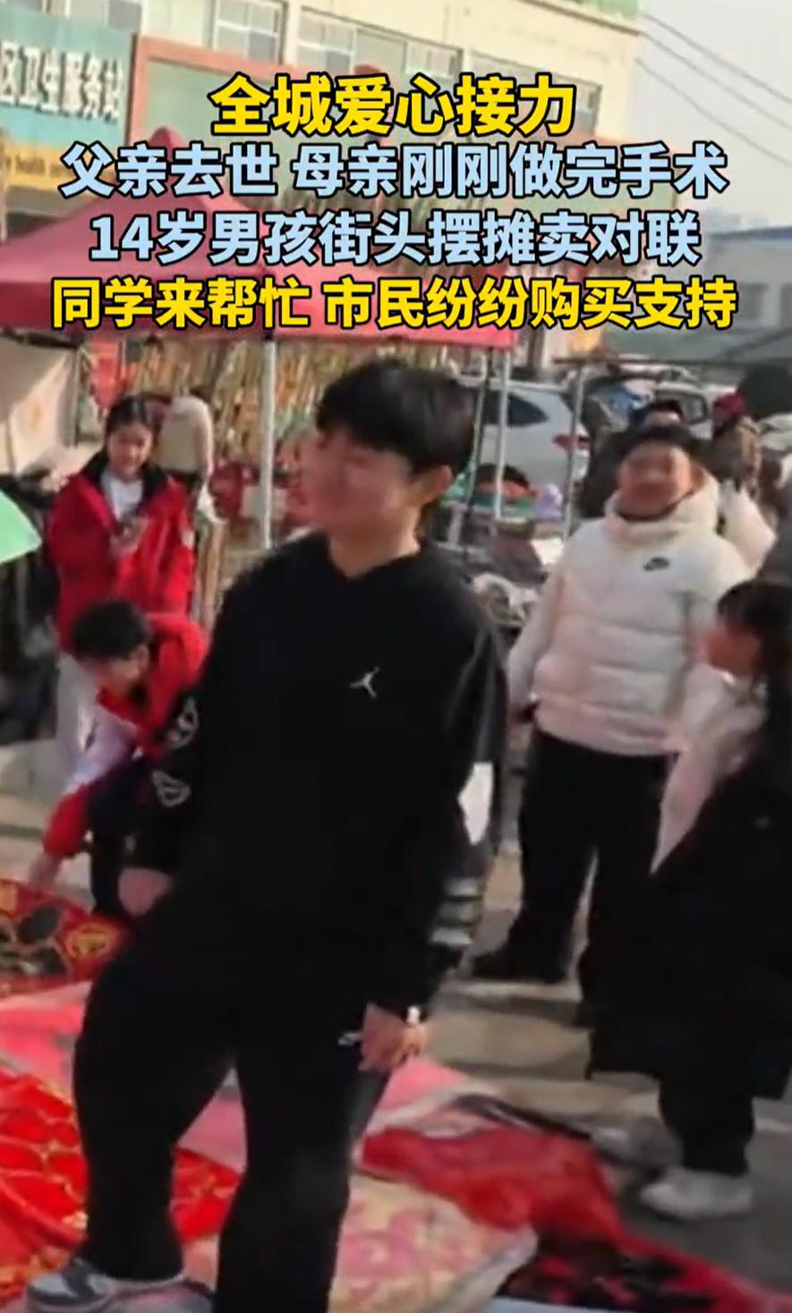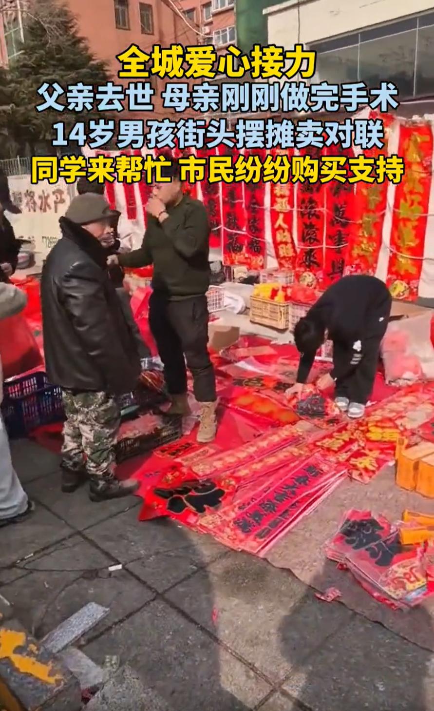 看哭了!山东招远,一男孩家里父亲去世,母亲做完手术在休养,别人都是一家过年,他却在路边摆摊卖对联,而不少人得知此事后纷纷赶来,有钱的出钱,有力的出力,男孩一句话让人破防:我长这么大,第一次有这么多人关心我 一开始,男孩的经历是一名男子先发现的,他以为男孩是假期出来体验生活的,就走过去挑了几副对联。付钱的时候随口问了句:你家大人呢? 男孩开始并没吭声,男子也是当爹的人,看孩子这反应就觉得不对劲,又多问了几句。男孩憋了半天,终于说出了实情,他妈刚做完手术,还在医院躺着,他爸已经不在了。快过年了,出来摆摊卖对联,想挣点医药费 男子听完心里很不是滋味。决定帮一把。于是,他退掉了两个对联,塞进200块钱准备买下去 但孩子看到后,立马追了上来,把钱退回给了男子。那个男子觉得孩子不容易,于是第二天带了10斤牛肉送给他,想着给孩子一些帮助 谁知,男孩死活不肯收,说自己有难处不想麻烦别人。男子便开玩笑地说:“你想报答我,把这些牛肉做成饺子,给我吃。”原本只是随口一说,结果男孩真记住了 当晚,孩子按照承诺做了饺子,亲自端给男子,表达着自己的一份心意 男子被这份真诚打动,毫不犹豫地把这件事发到了网上,没想到引起了广泛关注。很多人纷纷赶来帮忙,不仅买了对联,还有些人送去了物资,甚至有同学专门前来帮孩子一起卖对联 说实话,得知这个经历后,很难不让人感动,那些赶来买对联的人,不一定都缺对联。他们就是想让孩子知道,这世上有人在看他 男孩说第一次有这么多人关心他。这话听着心酸,但也让人庆幸,起码这一次,他被看见了 父亲去世母亲做手术 男孩摆摊卖对联