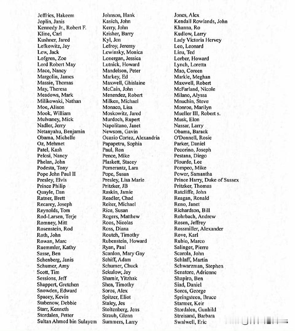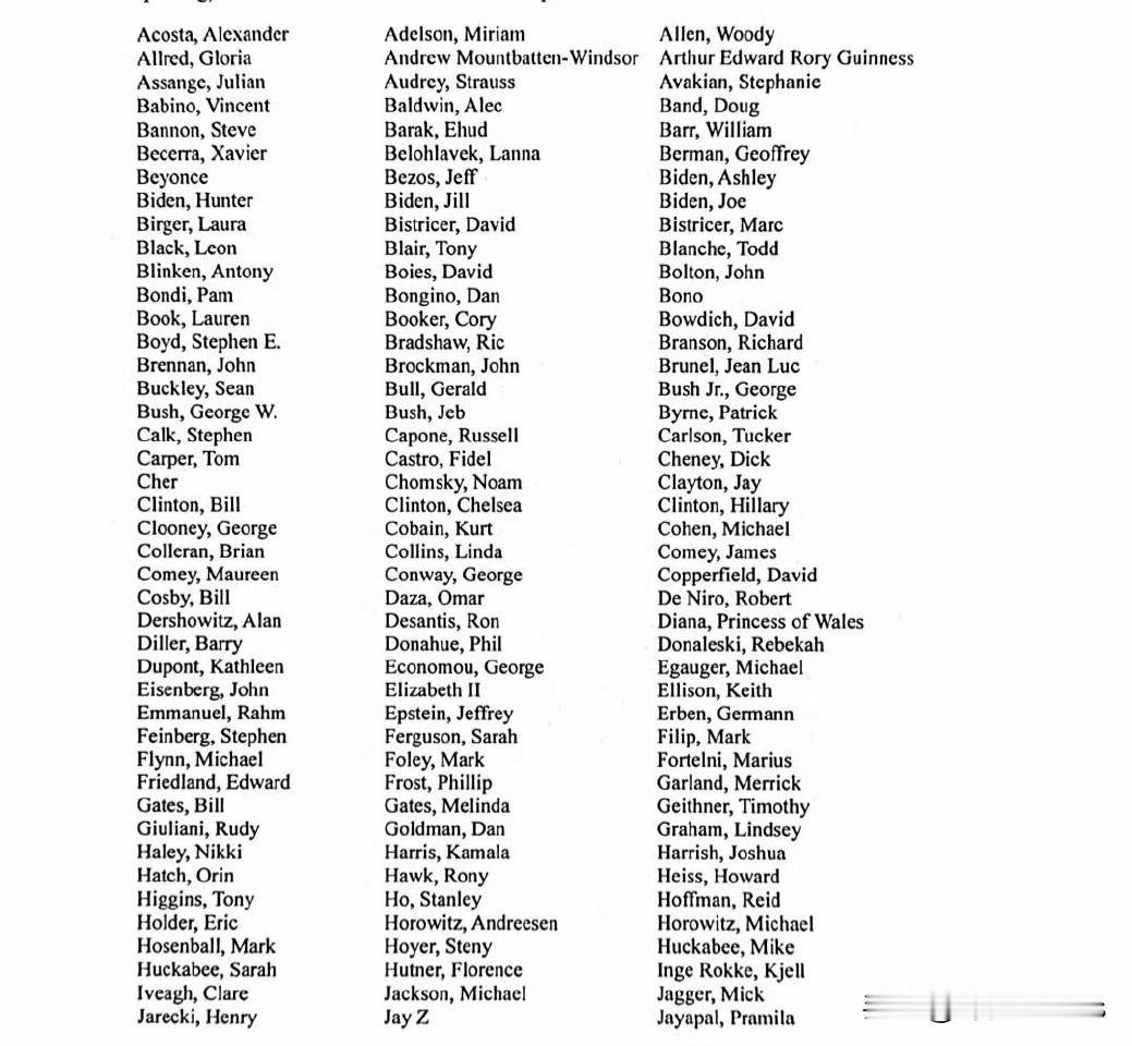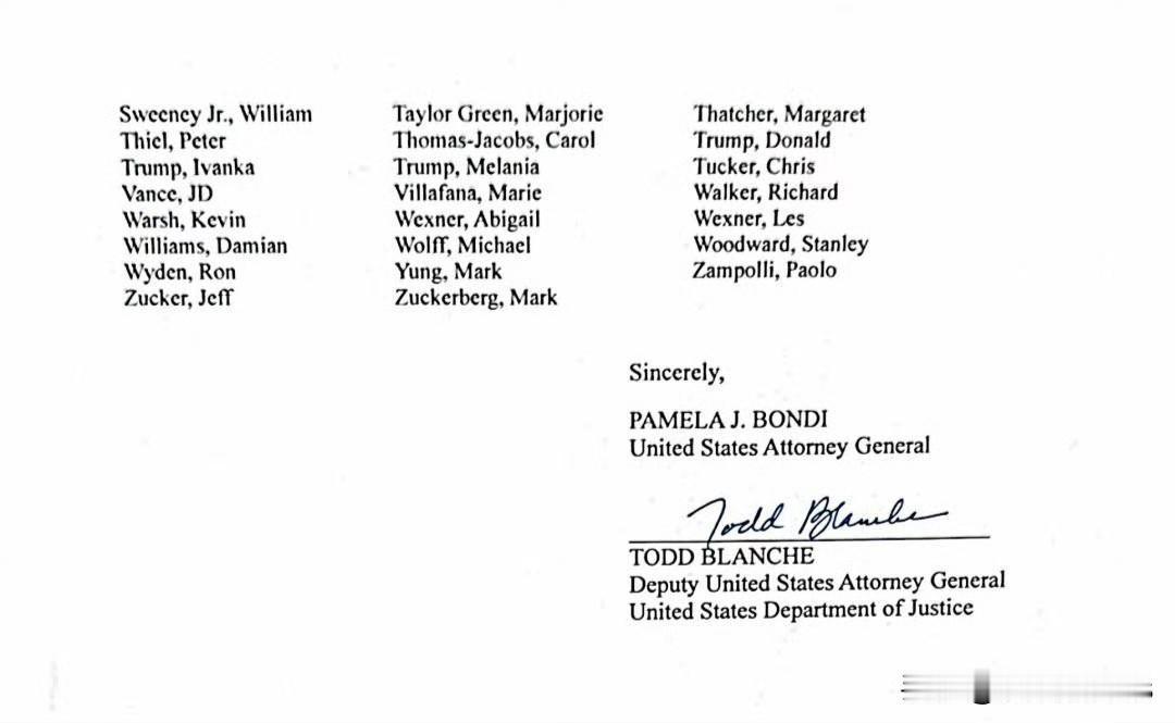 美国司法部长帕姆·邦迪公布了爱泼斯坦文件中提及的名人完整名单。 据福克斯新闻援引她致国会的信件报道,名单上的名人包括唐纳德·特朗普、巴拉克·奥巴马和米歇尔·奥巴马、哈里王子、比尔·盖茨、伍迪·艾伦、金·卡戴珊、科特·柯本、马克·扎克伯格和布鲁斯·斯普林斯汀。名单上共有300多人,他们曾是或现在仍是政府官员或公众人物,其名字至少在文件中出现过一次。 司法部指出,名单上的名字出现在"各种各样的上下文中":从与爱泼斯坦或其同伙吉斯莱恩·麦克斯韦的直接通信,到与犯罪活动无关的文件中提及的名字。 爱泼斯坦大丑闻