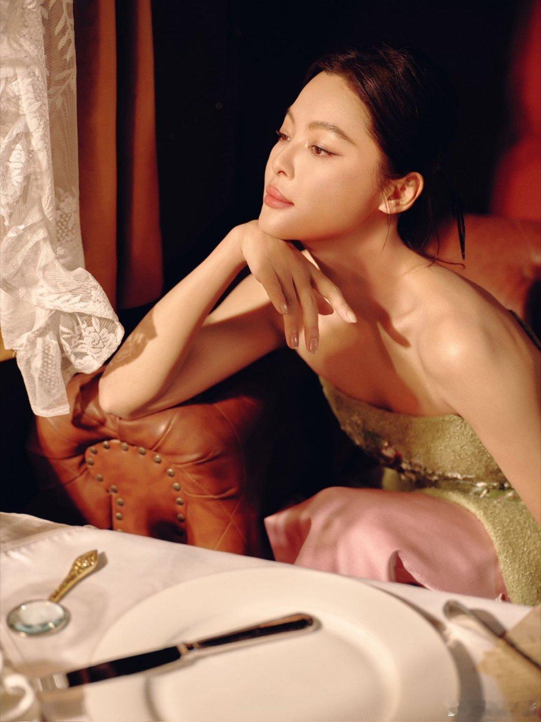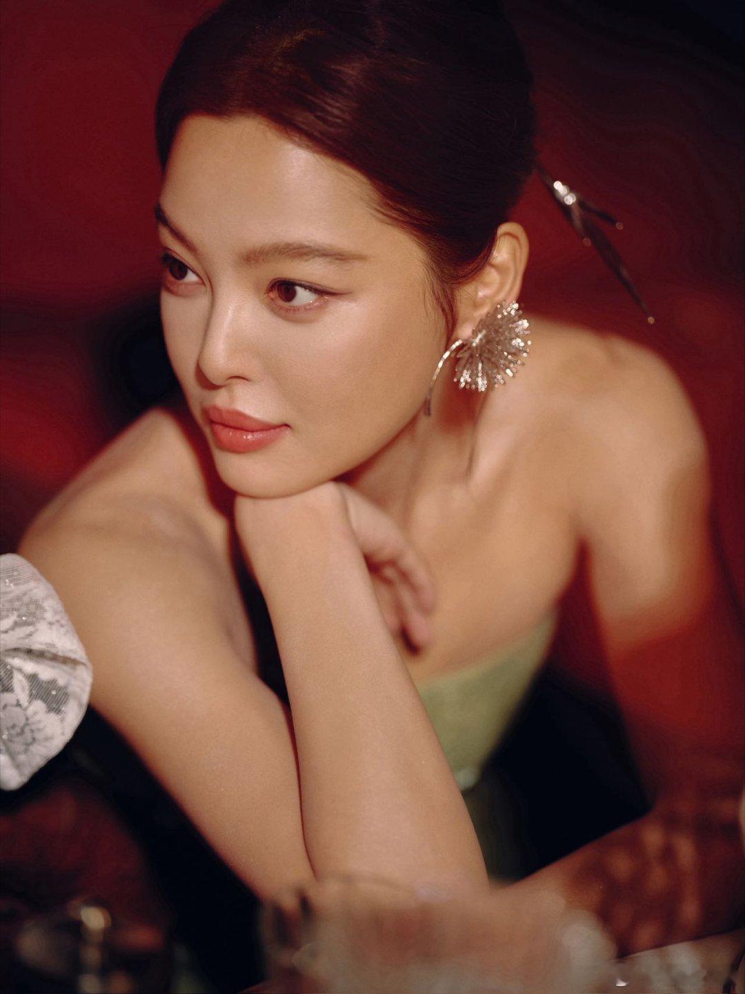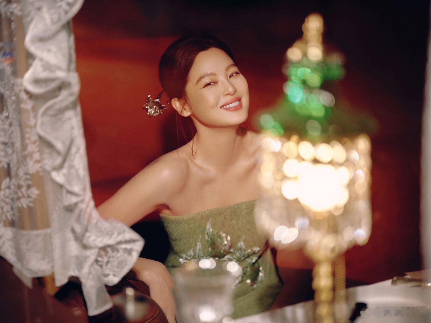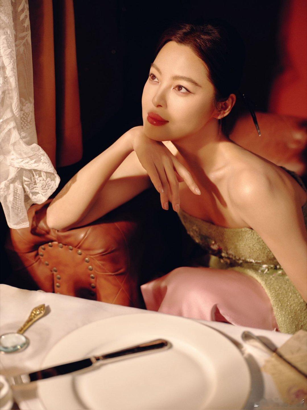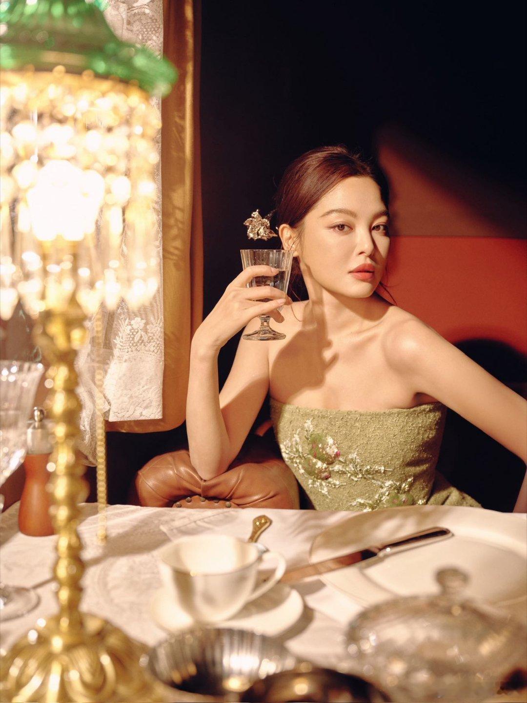 辛芷蕾暮色爬上蕾丝窗棂,青瓷灯盏摇碎一屋鎏金。碧罗绣裙裹着春风,银蝶耳坠吻过香肩。辛芷蕾新中式贺岁大片春晚新春茶话会