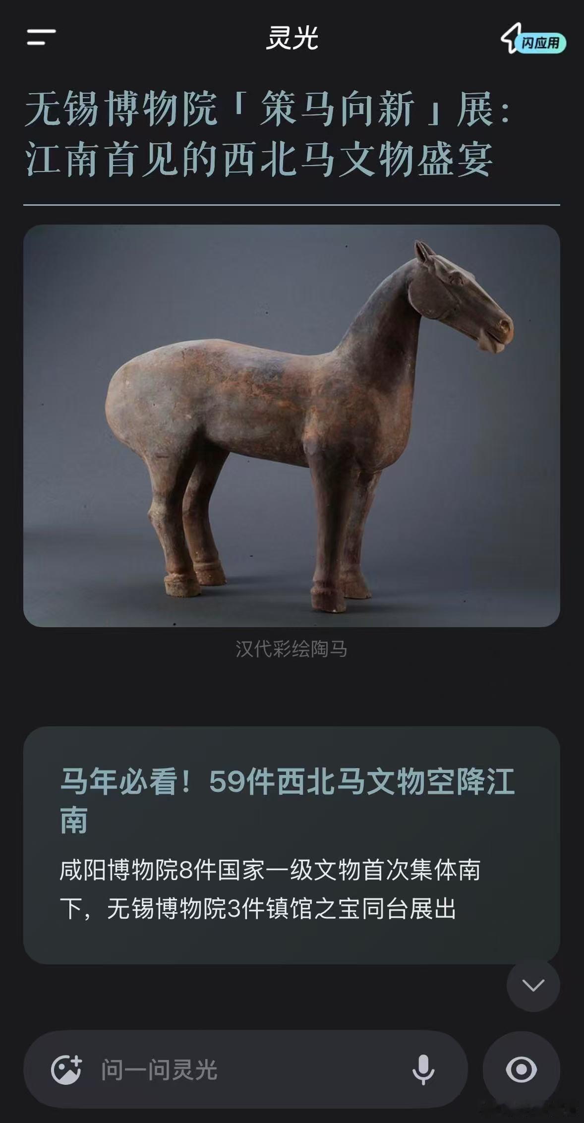 我的马年抓马之旅 无锡的朋友别错过!让灵光帮我看看无锡博物院有啥好玩的,才知道这次“策马向新”展有好多咸阳来的宝贝,比如汉代的彩绘陶马。咱江南地区出土的马文物本来就不多,这次能在门口看到西北来的“马明星”,机会太难得了。灵光带你去抓马
