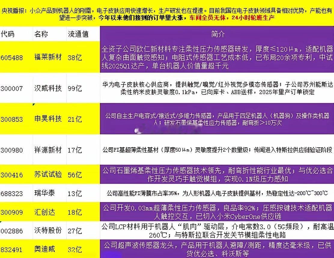 60、特斯拉都在抢,国产“电子皮肤”。 国产电子皮肤(柔性触觉传感系统)的核心进展、代表成果与应用方向,截至2026年初,头部企业与量产进展。福莱新材(欧仁新材料):压阻式路线领先,厚度120μm,响应92%,获大基金二期支持,与灵心巧手等合作,机器人电子皮肤成本可控;汉威科技(苏州能斯达):多技术路线并行(压阻/压电/电容),压力精度0.1N,小批量量产,合作华为、优必选等;申昊科技:聚焦电力巡检机器人,电子皮肤模块单价高、毛利率超70%,市占率突出。 技术路线与应用场景AI人机感肤质柔性电子皮肤 主流路线:压阻式(成本低、易量产,机器人首选)、电容式(灵敏度高)、压电式(适合动态冲击)、离电型(研发中,性能优); 场景:人形机器人灵巧手/全身触觉、医疗假肢/康复反馈、工业精密检测、可穿戴健康监测。挑战与趋势 挑战:大面积一致性、长期稳定性、功耗控制、规模化降本; 趋势:感算一体(AI算法嵌入柔性芯片)、多模态融合、国产化替代加速,政策层面工信部等已明确支持突破相关核心技术。电子皮肤概念股柔性触觉