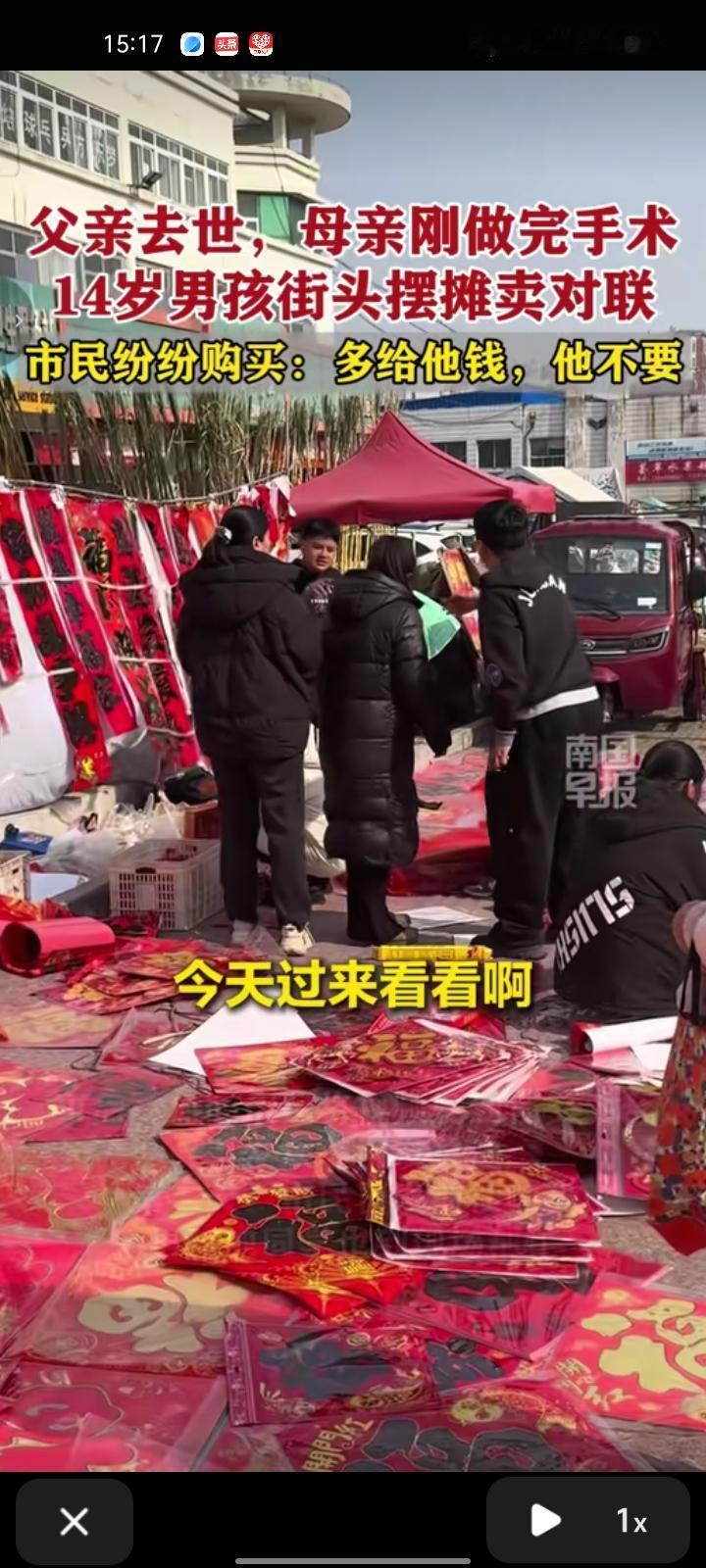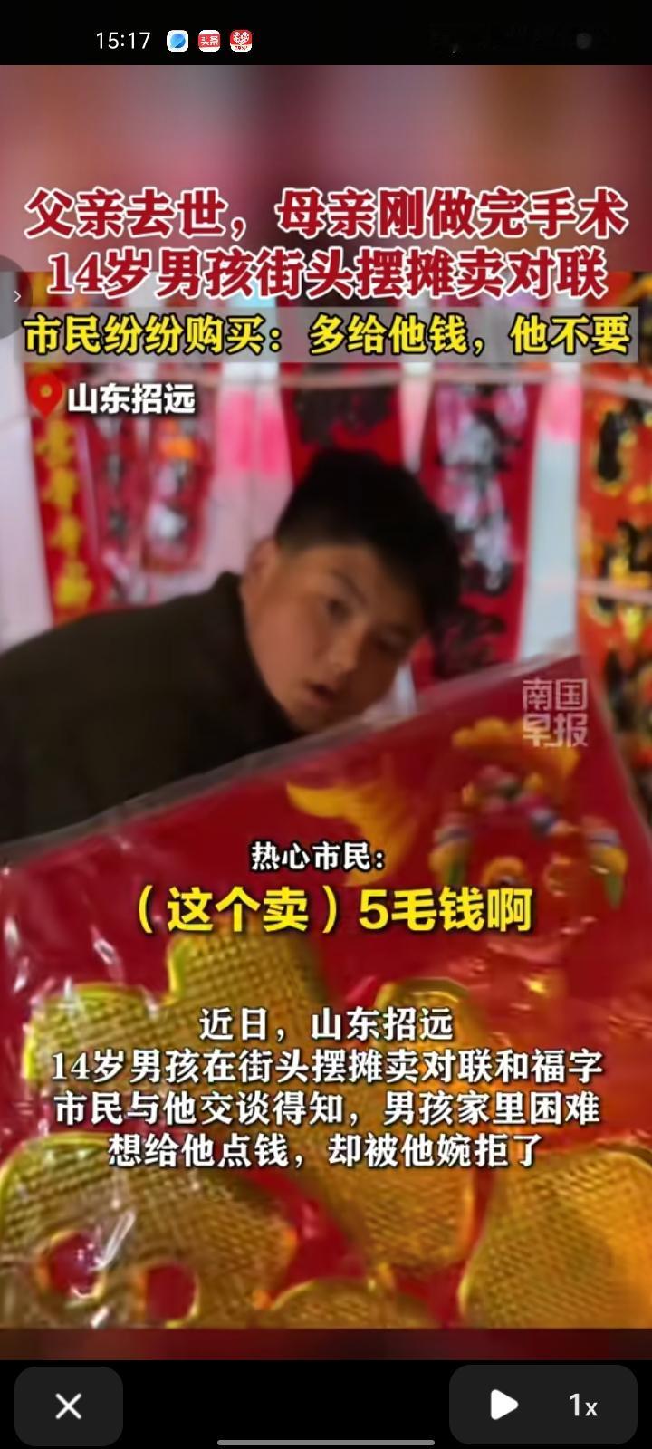 2月12日,烟台招远市。14岁男孩在街头摆摊卖对联和福字,市民与他交流后得知,男孩家里有困难,父亲去世,母亲刚做完手术,想给他点钱却被他婉拒了。 事后,有热心市民把视频发到社交平台,引发不少网友关注。第二天,市民们自发前去购买,男孩的同学也去现场帮忙