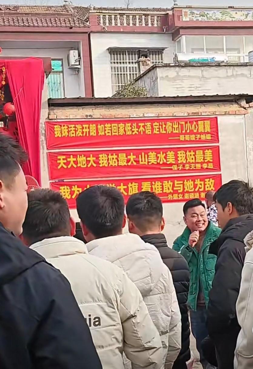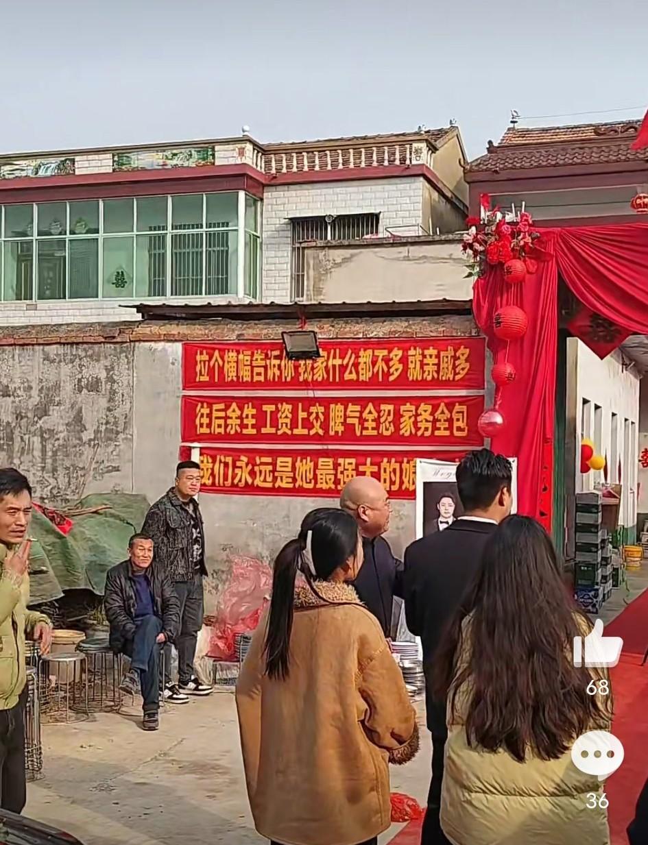 结婚现场,新娘家的门口拉起了多条横幅,上书: “拉个横幅告诉你,我家什么都不多,就亲戚多”。 “往后余生,工资上交,脾气全忍,家务全包”。 “我妹活泼开朗,如若回家低头不语,定让你出门小心翼翼”。 …… 网友锐评:这横幅多多少少带着威胁的性质,这不是娶了一个老婆,是娶了一个祖宗回来供在家里了! 大家觉得这个新娘家是哪个地方的?