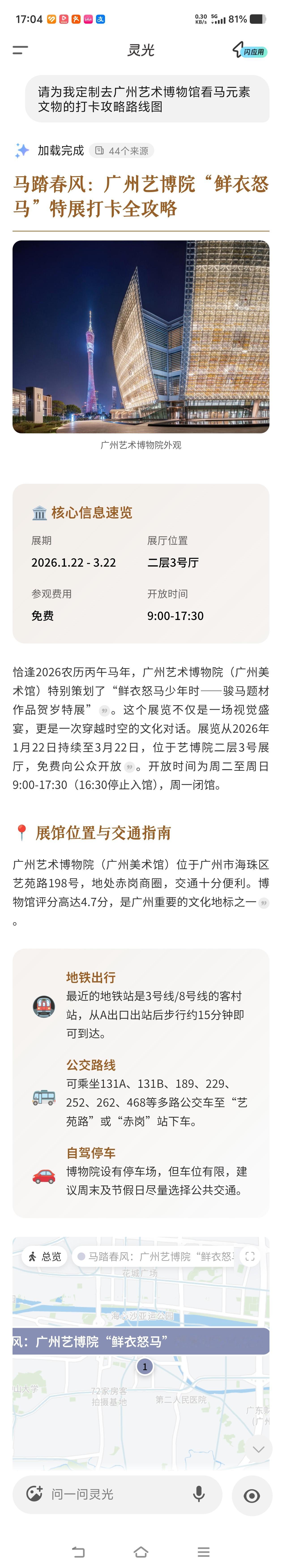 我的马年抓马之旅 今天用灵光查了查广东的马文物,没想到咱们也有这么多“好马”!比如广州艺术博物馆还有南越王博物院,各具特色!这两博物馆离我也都不远,过两天就带着家人一起去看看。让灵光给我规划了个一日游攻略,真是非常全面了,介绍的都是省力、省心的路线,十分贴心了。灵光带你去抓马