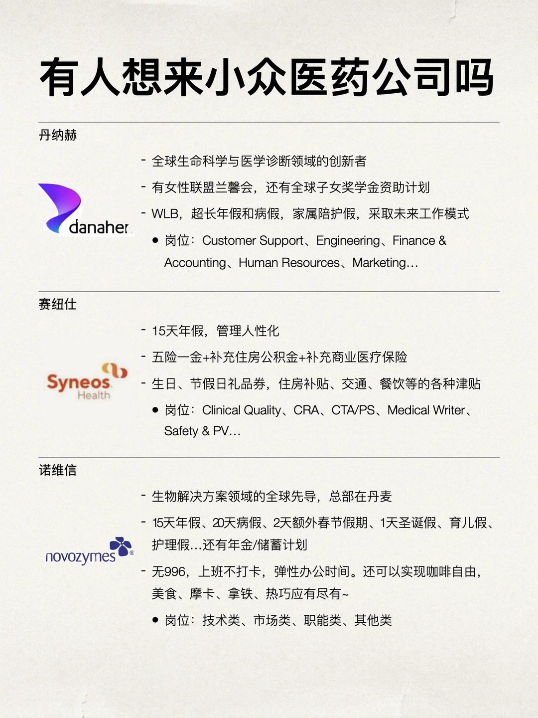其实在大健康领域下,很多小众细分公司,反而业务更稳、壁垒更高,很适合想入行的人。比如说做一些器械类、垂直方向的,发展都不错 整理的这几家,都属于低调但很有分量的方向。节奏和氛围也都挺好的,基本 955,年假 15 天起,长期发展会很稳 而且无论是经验丰富专业性强的、还是没什么经验的,都有机会入门 坚持日更✊🏻,对外企感兴趣的欢迎常来看看