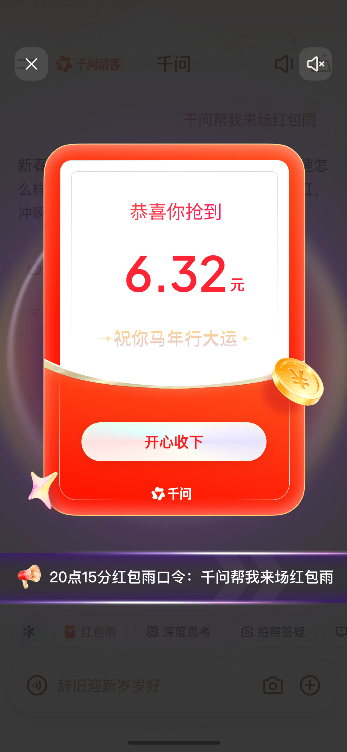 易烊千玺邀你上千问领红包又幸福了,现实拿到了千玺的专属口令红包🥰 又正好赶上千问除夕夜红包雨真是太好了,抢到6块多,也太大方了~不得不说,春节千问这波免单卡真的是拿爽了!我还领了25元超级免单卡,在千问AI买电影票、点奶茶去。惊蛰无声