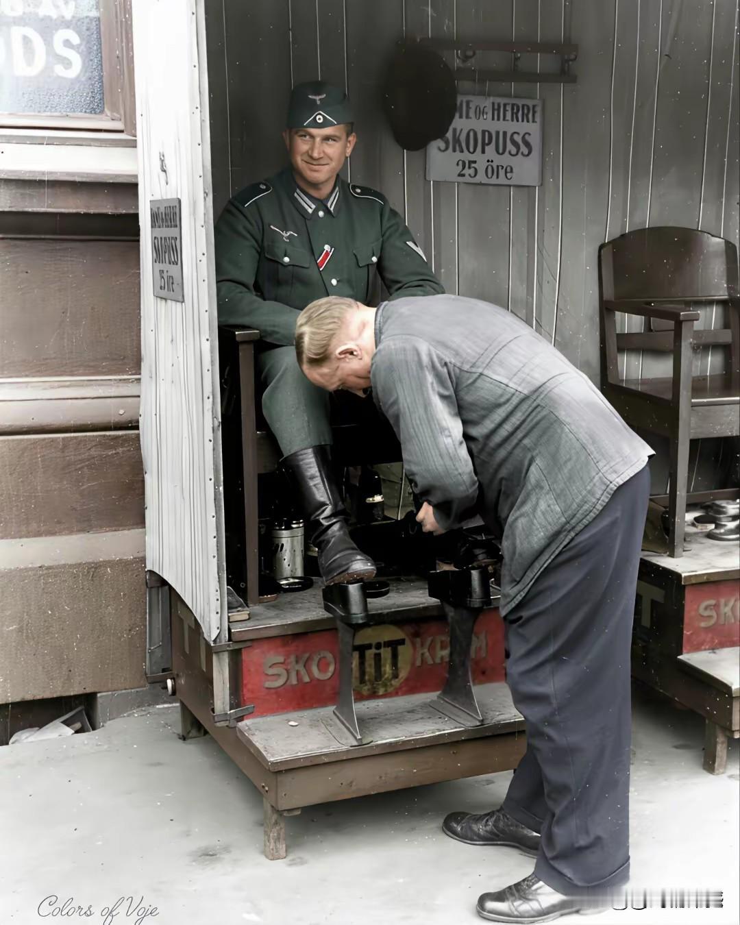 二战期间的老照片,坐着享受服务的,是一个德国的军人,弯着腰为他服务的这个人,是个挪威人,这张照片拍摄于上个世纪40年代,看来在那个时候,擦皮鞋这项业务,就是很流行的,也不知道从什么时候开始,基本上不穿皮鞋,现在全部是旅游鞋,家里也不摆鞋油了,也没有擦鞋的刷子和布了,感觉省了很多力气!