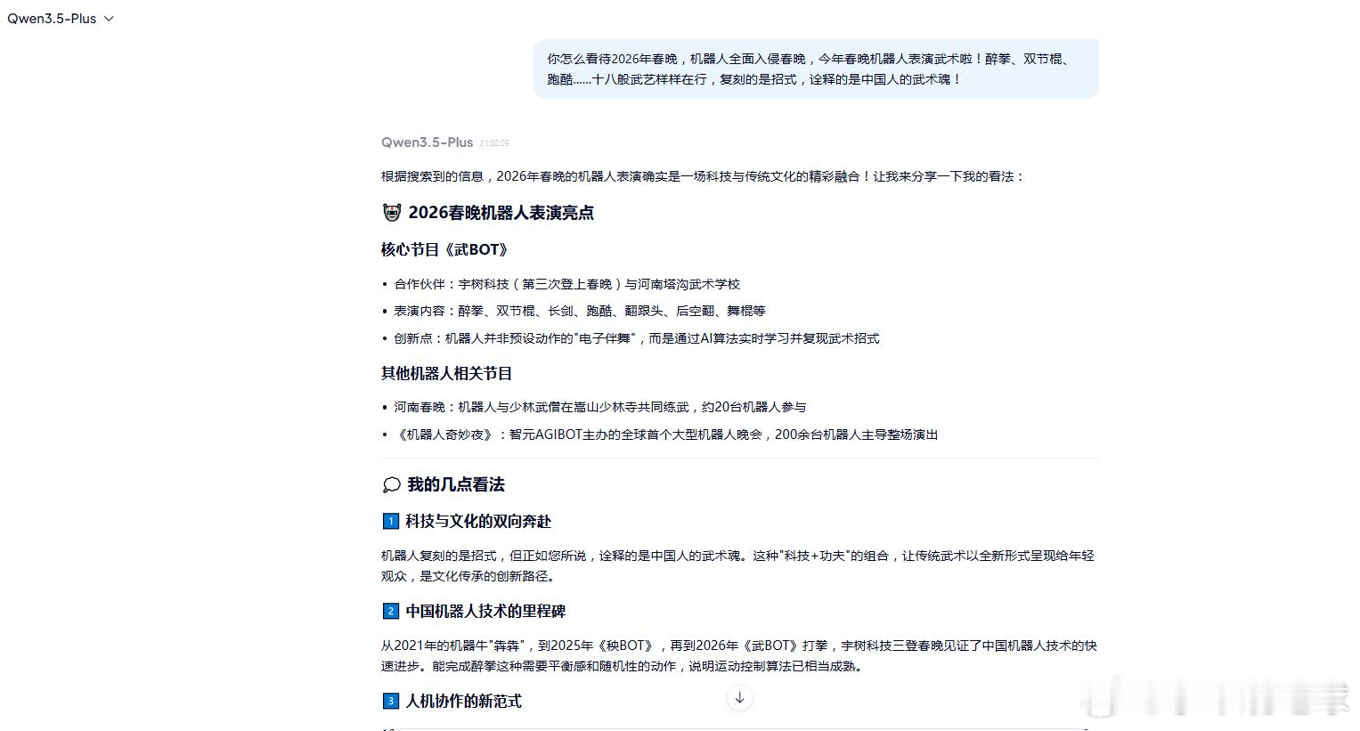 我AI聊春晚 2026年春晚的机器人表演真的让人热血沸腾!当机器人打出醉拳、舞起双节棍、完成跑酷后空翻时,我看到的不仅是技术的突破,更是中国传统文化在科技时代的华丽新生。机器人复刻的是招式,诠释的却是中国人的武术魂。1380名塔沟武校学员与数十台机器人同台,8岁孩童的后空翻与机器人的毫米级走位严丝合缝,这不是机器替代人类,而是人机协作的全新范式。从2021年机器牛"犇犇"到2025年《秧BOT》扭秧歌,再到今年《武BOT》打拳,春晚见证了中国机器人技术的飞速进步。能完成醉拳这种需要平衡感和随机性的动作,说明我们的运动控制算法已相当成熟。海外社交平台也热议中国机器人进步速度,尤其对后空翻、双截棍等动作惊叹。科技与文化的双向奔赴,让传统武术以全新形式呈现给年轻观众,这才是文化传承该有的样子。当机器成为武者,武术的内核没有变,变的只是表达的方式。为中国智造点赞,为文化自信喝彩! 部分内容来源