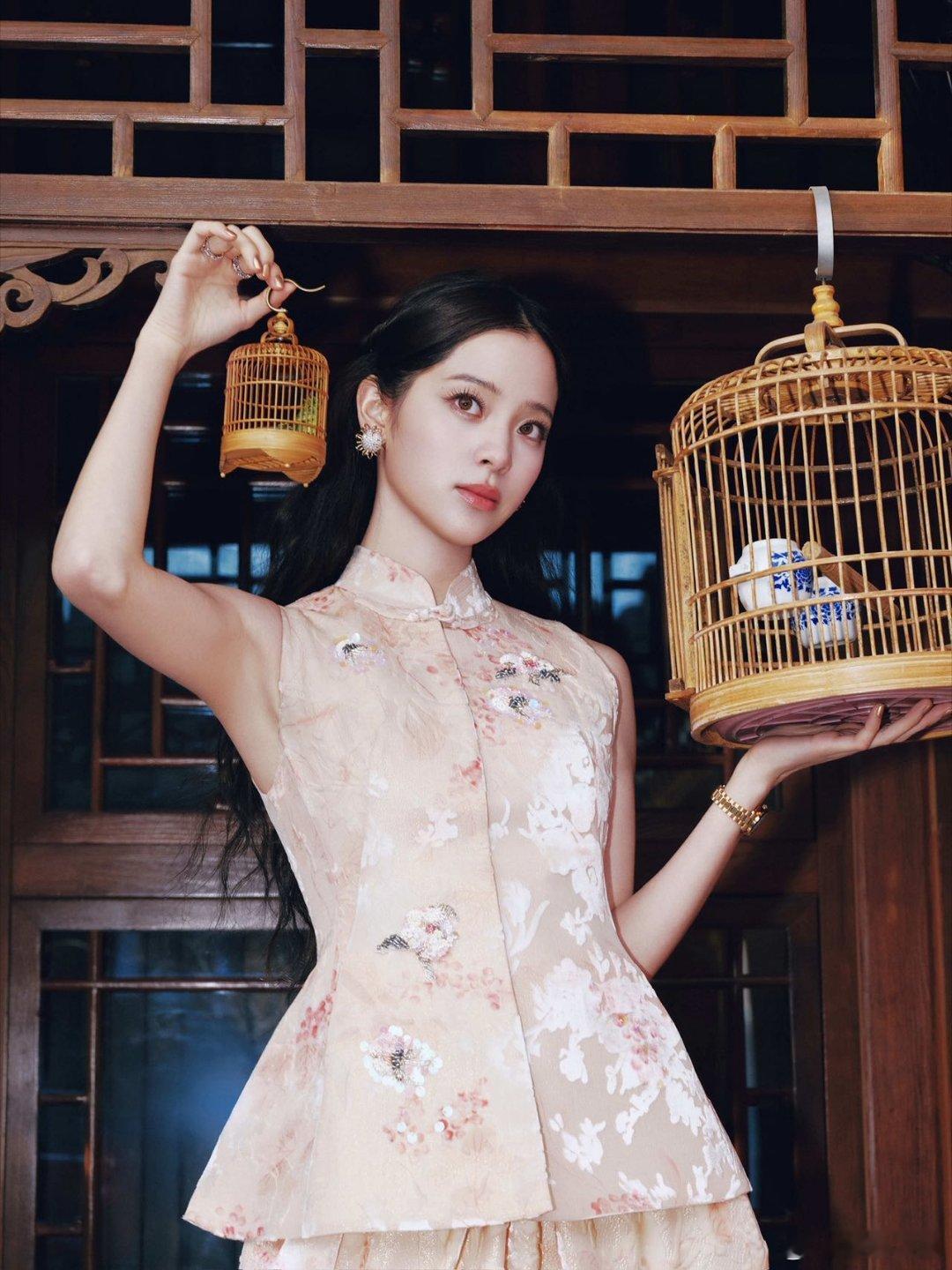 欧阳娜娜雀笼轻晃惹茶香,指尖拈起岁月的骨牌,老窗棂把光影剪成水墨长卷。醒狮腾跃染红灯笼,云纹旗袍裹着春风漫过雕梁 千年故事在盘扣间轻轻摇晃。欧阳娜娜白牡丹新中式礼服春晚新春茶话会