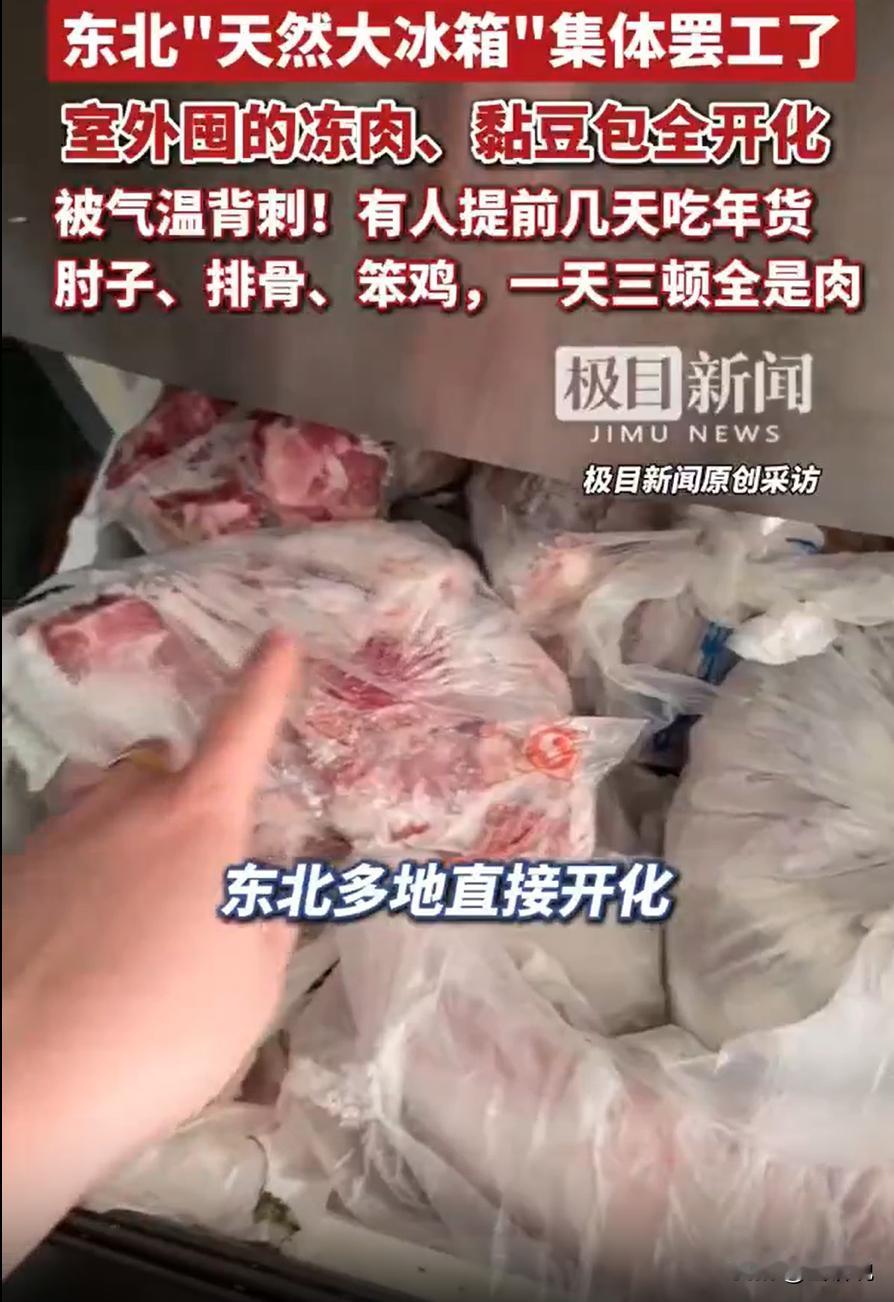 千算万算没算到天气!吉林长春的于女士,过年在家囤了足足500斤年货,本来以为和往年一样,往院子里、阳台上一放,靠着东北的严寒当天然大冰箱,就能安安稳稳放到开春,结果今年气温一个劲往上升,外面彻底冻不住了,全家现在一天三顿饭顿顿吃肉,卯足了劲消耗,可那堆年货还是不见少,急得一家人团团转。 于女士说,这500斤年货可不是随便囤的,都是实打实的硬货,也是东北农村过年的老规矩了。今年一进腊月,家里就张罗着杀年猪、宰羊,都是自家养的笨猪笨羊,不喂饲料,肉质特别好,杀完之后分割好,一部分留着自己吃,一部分准备走亲戚。 再加上亲戚邻里之间的人情往来,你送我一块排骨,我给你一块羊肉,他拎来几只笨鸡,零零碎碎加起来,院子里靠墙的地方堆得满满当当,少说也有五百斤,全是用袋子装好的冻货。 放在往年,这都不算事儿,长春的冬天零下二三十度是常态,阳台和院子就是天然的保鲜库,把肉往那儿一放,用不了半天就冻得梆梆硬,别说放到开春,就算放到四月份,也照样新鲜,根本不用愁存放的问题。 谁能想到,今年的天气彻底打乱了一家人的计划,气温比往年同期偏高了不少,有时候中午最高气温都能接近零度,连院子里的积雪都化得差不多了,那种能把肉冻得咬不动的严寒,今年压根没出现几天。 一开始于女士还没太在意,觉得偶尔升温没关系,等冷空气一来就好了,可连着十来天都是这样的暖天,她才发现不对劲——院子里的冻肉开始变软,有的甚至已经微微化冻,用手一摸都能感觉到潮气,再放下去,用不了两天肯定会变质。 这一下,全家彻底坐不住了,连七十多岁的老太太都急得睡不着觉,搬个小马扎坐在门口指挥大局,生怕哪块肉没照顾到坏了可惜。家里的男人全员上阵,挽着袖子往屋里扛肉,一趟又一趟,累得满头大汗,胳膊都酸了,院子里的冻货也才搬了一半。 女人们则围着冰箱和冰柜转,分工明确,有的负责拆袋子,有的负责往冰箱里塞,尽量把每一寸空间都利用起来。家里的双开门冰箱,冷冻室塞得严严实实,连抽屉都拉不开,冷藏室也被占了一半,专门放那些已经微微化冻、需要尽快吃的肉; 两个立式冰柜也没能幸免,从底层堆到顶层,连缝隙里都塞了小块的肉,可就算这样,还是装不下剩下的冻货。 没办法,一家人只能挑着往冰箱里放,先紧着好的部位,比如排骨、五花肉、羊腿这些,都是平时舍不得吃、也更容易变质的,先优先放进冰箱保鲜,剩下的那些肉块、碎肉,只能暂时还放在院子里。 为了尽量延缓化冻,一家人找来了两层厚厚的棉被,严严实实地盖在冻货上面,还时不时去检查一下,摸一摸肉的硬度,生怕出一点差错。其实于女士心里也没底,棉被只能起到一点点保温作用,遇上中午的暖天,还是挡不住温度升高,说不定过两天,这些没放进冰箱的肉,还是会慢慢化冻。 现在于女士家最头疼的,就是怎么把这些肉尽快吃完,全家上下开启了“吃肉模式”,一天三顿饭顿顿离不开肉,早上蒸排骨、炖羊肉,中午炒肉丝、炖肉块,晚上要么吃火锅,要么吃烤肉,连凉菜都是凉拌肉丝,就算这样,消耗的速度还是赶不上化冻的速度。 家里人都开玩笑说,今年过年,别的没吃到多少,肉是彻底吃够了,再吃下去,恐怕开春都不想碰荤腥了。可玩笑归玩笑,看着院子里盖着棉被的冻货,一家人还是犯愁,毕竟这些都是用心囤的年货,还有亲戚之间的人情在里面,要是坏了,不仅可惜,也辜负了邻里的心意。 其实不止于女士家,今年长春不少农村家庭都遇到了这样的难题,东北人囤年货的习惯,是刻在骨子里的,以前物资匮乏,冬天交通不便,买东西不方便,所以一到过年就会多囤点,靠着天然大冰箱过冬,这也是祖辈传下来的习惯。 可今年的暖天,让这个延续了很多年的习惯,变成了难题。一家人也试着想过别的办法,比如送给城里的亲戚,可亲戚家的冰箱也都塞得满满的,根本腾不出地方;想做成腊肉、腊肠,可天气太暖,也不适合腌制,容易变质。 现在于女士家只能继续靠着“猛吃”消耗年货,同时盼着气温能降下来,让院子里的天然大冰箱能重新“上岗”,可看着天气预报,未来几天还是暖天,一家人心里的石头始终落不下来。 不知道有没有和于女士家一样,今年囤了不少年货,却因为气温升高没地方放的朋友?你们遇到这种情况,都是怎么处理的?有没有什么好办法,能让这些冻货保存得更久一点?欢迎在评论区说说你们的经验和看法。