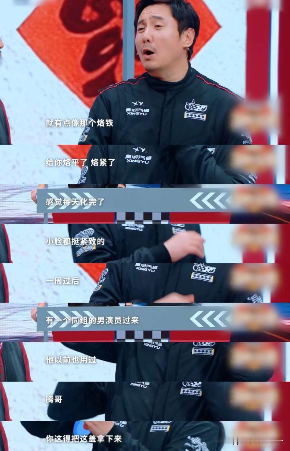 沈腾说:“曾经同事送我一个美容仪,我花了几天时间看说明书把它研究明白了,就是拿着它在我脸上某个地停一会儿,再换个地,有点像烙铁,就是把我脸上的肉烙平了烙紧了,每天用完我感觉自己的小脸也挺紧致的。一周后,一个男演员过来,他以前也用美容仪,跟我说,滕哥,你得把那个美容仪的盖子拿下来再用。原来我用了一周,一直没有把盖子打开。” 沈腾用没开盖的美容仪,还依然会觉得脸热热的,这大概就是在脸上捂热的吧,至于他说的紧致效果,他连盖子都没打开,这完全就是心理作用嘛!