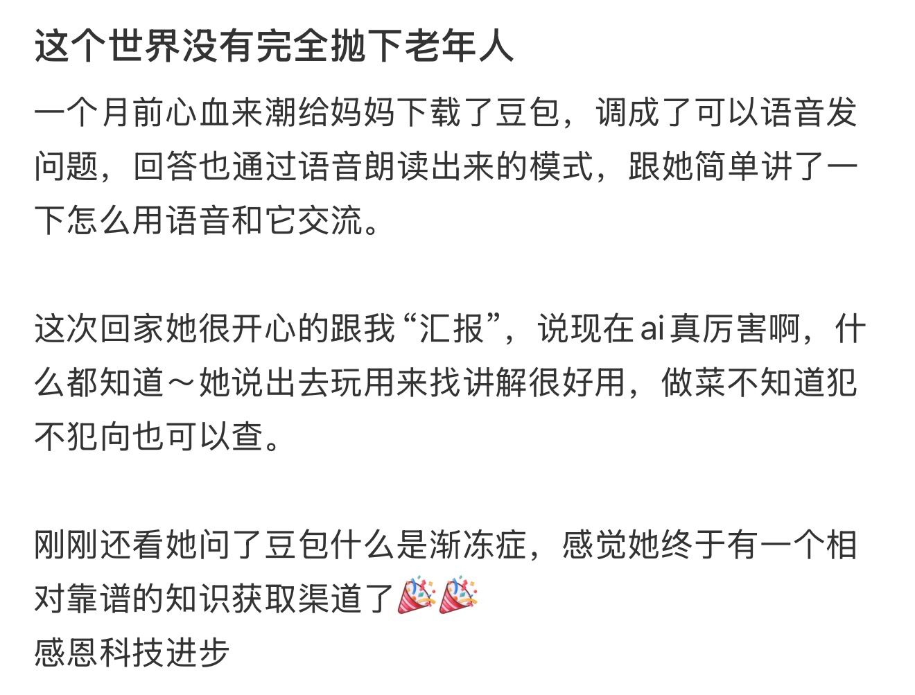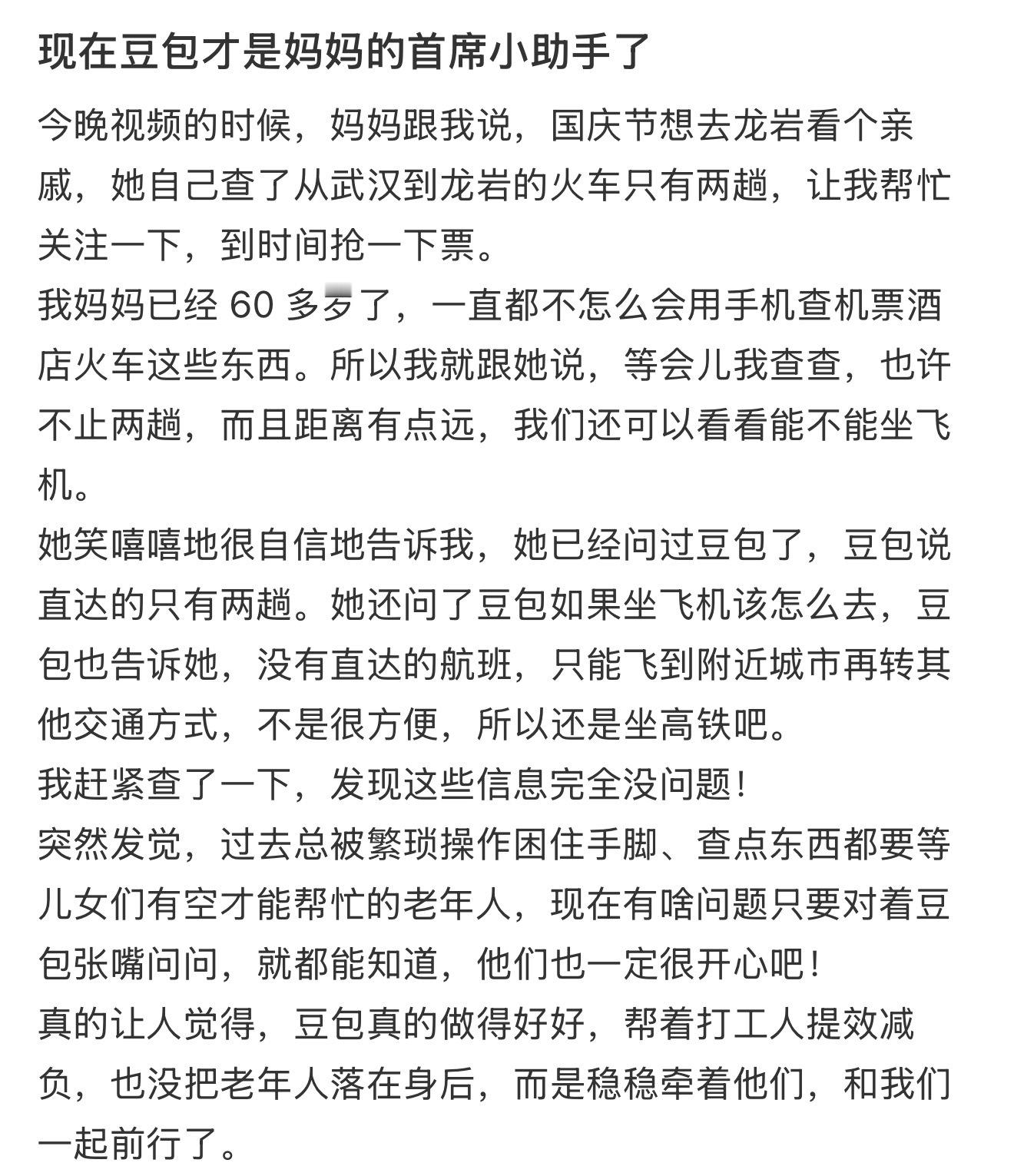 爷爷奶奶也爱用豆包现在豆包真的是国民级ai产品了,简单搜索都能发现很多长辈也在用豆包了老一辈人需要陪伴,他们对很多智能产品不熟练甚至不会用,而豆包真的给他们提供了一个获取知识的渠道和帮助,不再会被上当受骗,甚至豆包还能给长辈提供情绪价值科技发展的意义有了体现