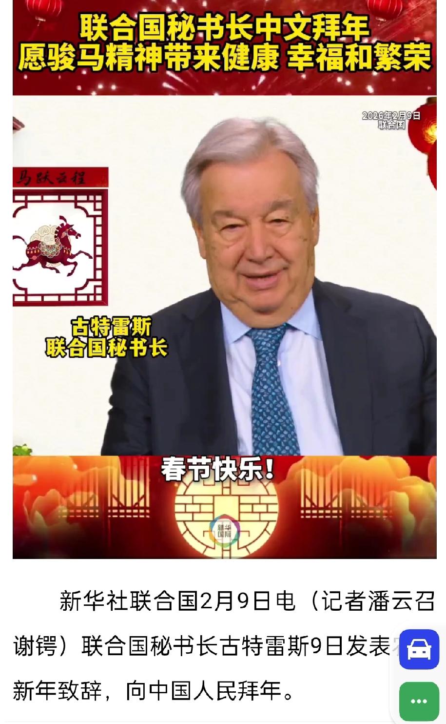 【马年春晚还没看够?看看联合国秘书长、东盟秘书长给中国拜年说了啥,信息量很大】今晚除夕,咱们吃着团圆饭看着春晚,地球村那边可没闲着。联合国秘书长古特雷斯专门用中文说“春节快乐”,特别提到感谢中国对“多边主义和全球团结事业的大力支持”。这话听着提气——咱中国在国际上的分量,人家看在眼里。 巴基斯坦总统扎尔达里更实在,不仅说“新年快乐”,还强调“与中国人民站在一起的理念已融入巴基斯坦人民的基因”。这才是铁杆兄弟该说的话! 最值得咱们华南乡亲关注的是东盟秘书长高金洪。他说马年象征“活力、优雅、前进动力”,东盟愿与中国在数字经济、绿色能源深化合作。为啥重点提这个?海南自贸港封关后,面向的正是东盟这个大市场。以前说“下南洋”,现在是咱们在家门口和东盟做兄弟生意。这匹马,是带着咱们华南一起往前奔的! 家人们,今晚文昌鸡上桌了吗?评论区打个“马到成功”,给咱祖国点个赞!(图源1:新华网;图源2:新华网;图源3:人民网)马年春晚 国际时政 中国影响力 联合国秘书长拜年 巴基斯坦总统 东盟秘书长 华南地区 海南自贸港 除夕快乐
