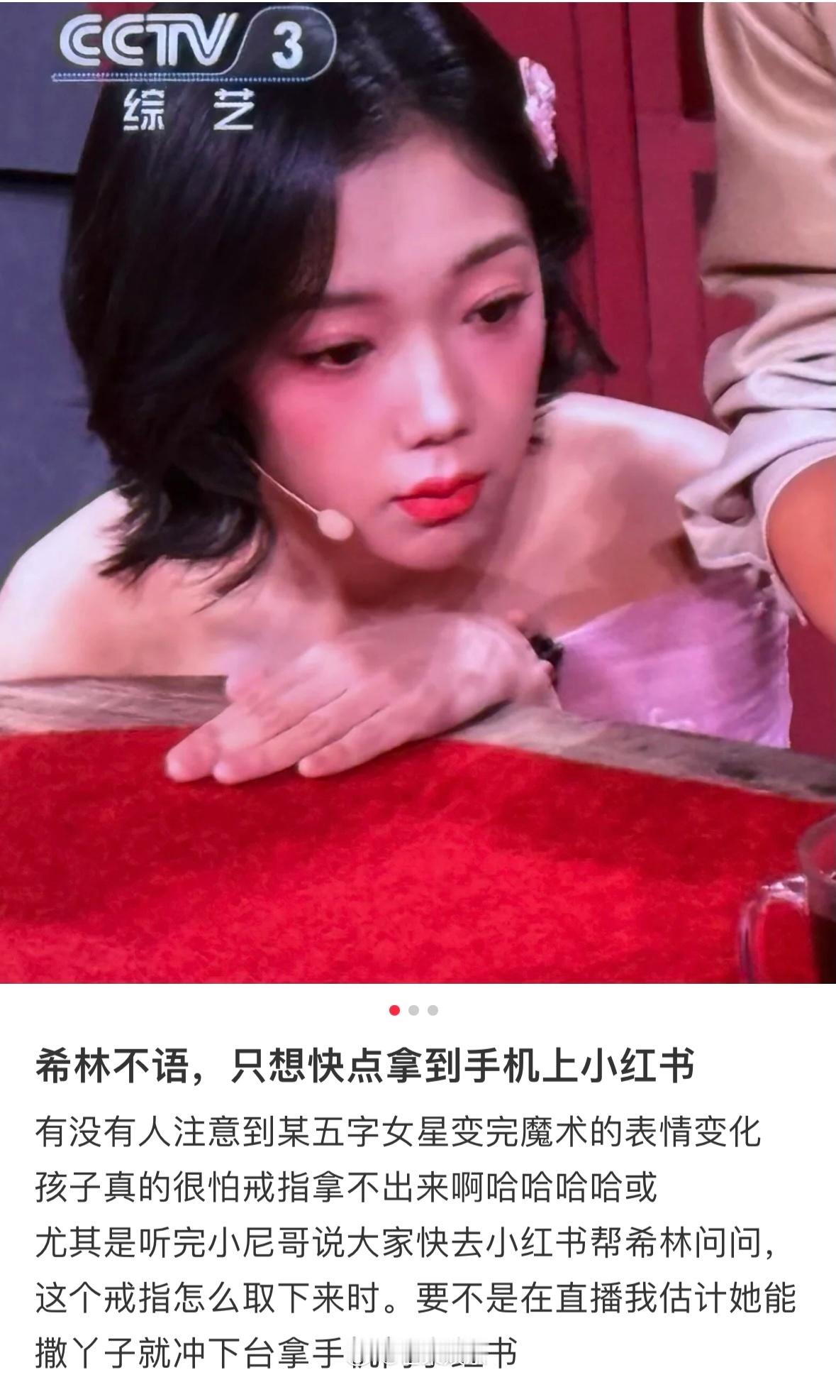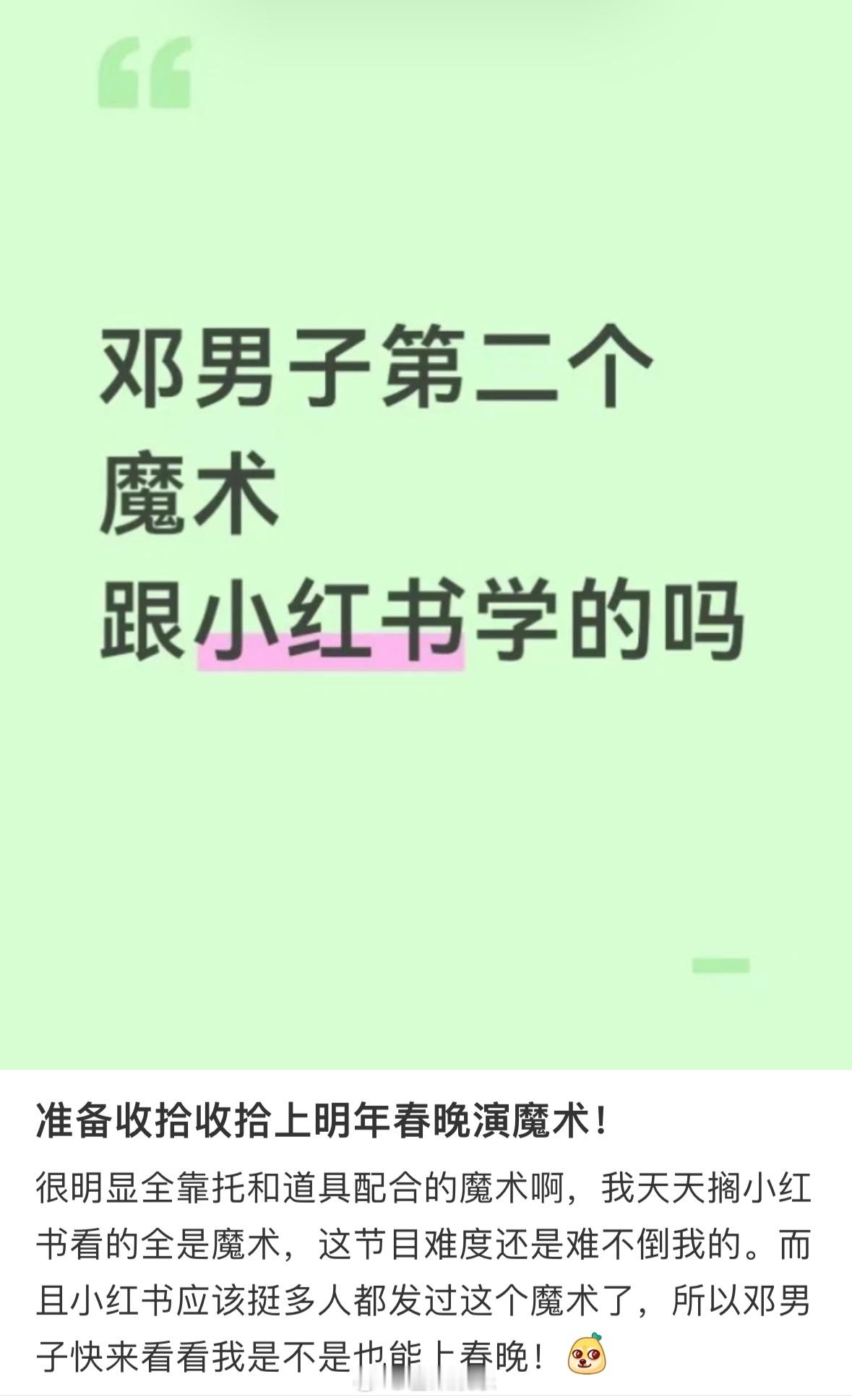 魔术 比小品好笑小红书的网友也太有才了!邓男子的魔术刚演完,评论区已经开始给希林娜依高出谋划策,研究怎么把那枚“藏”进杯子里的戒指取出来。看到有人提议请胧月公主来帮忙,我直接笑喷在沙发上,这脑洞真的没人能管了!