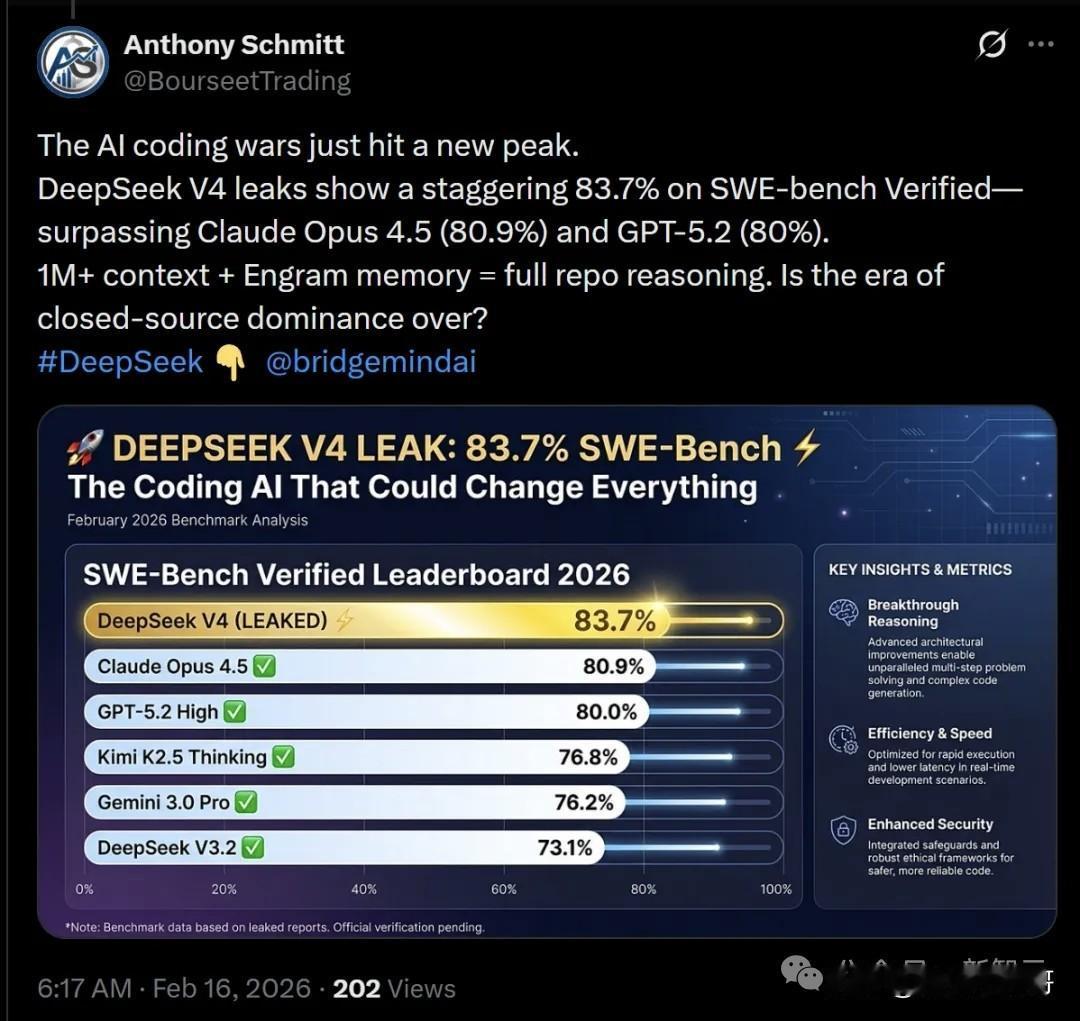 春晚一众人形机器人刷屏,宇树科技、魔法原子(传说追觅旗下)、延松动力、银河通用轮番刷屏。 明天,大年初一,DeepSeek即将刷屏,最新的DeepSeek V4跑分疑似泄露,这是要逆天? 不过现在也有消息,说可能会dely。 明天看吧。 机器人上春晚