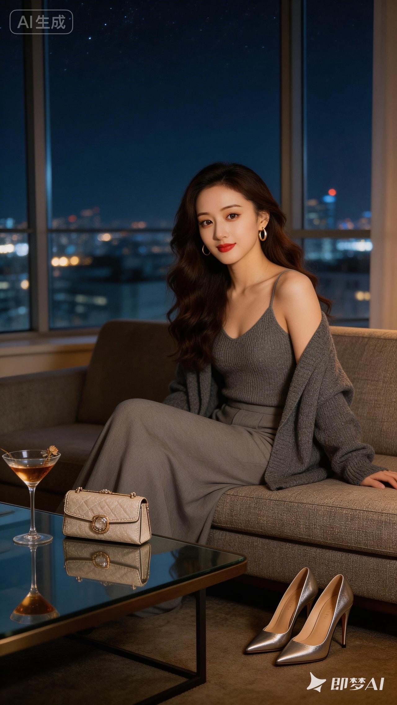 都市夜景下的优雅时光,时尚穿搭与美酒相伴。